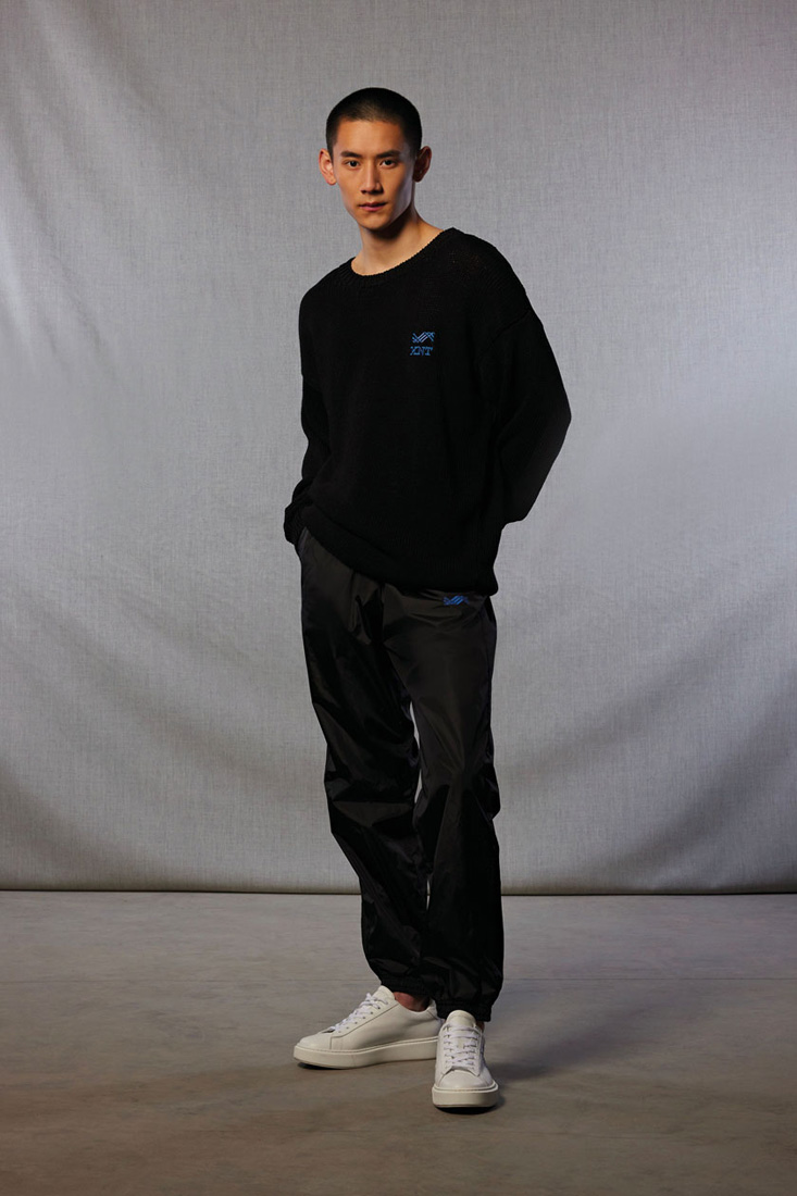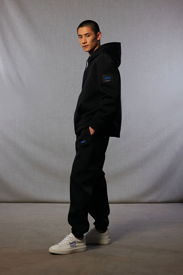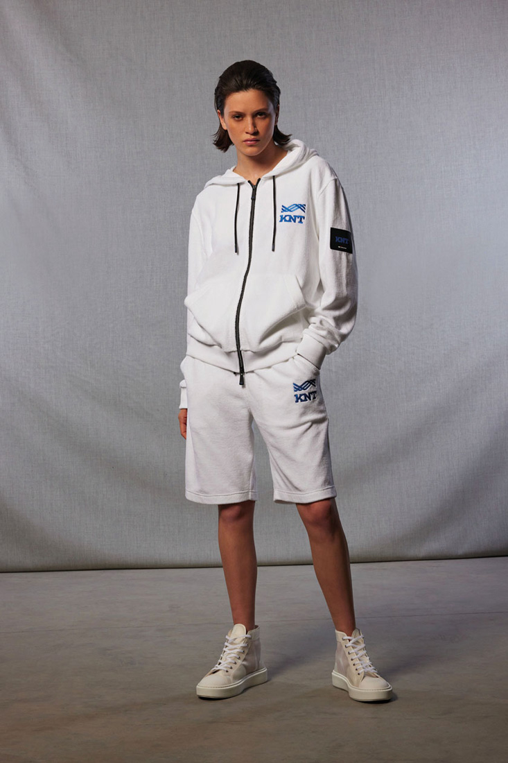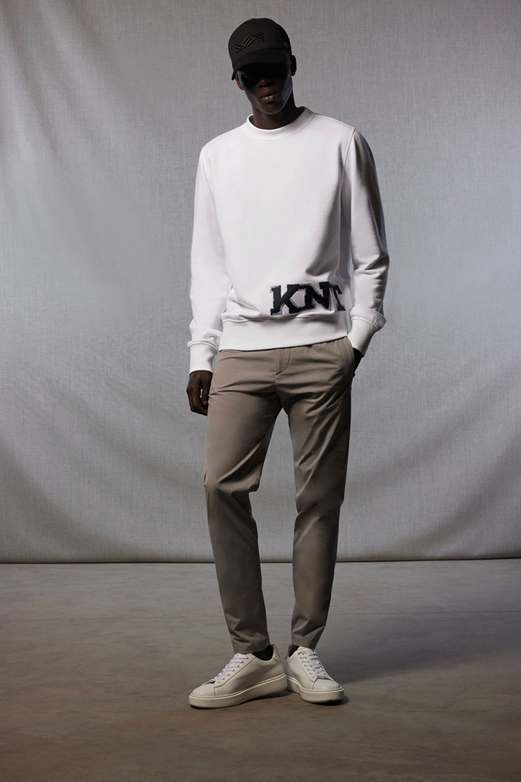 Una collezione, che però mantiene un aspetto sofisticato, e può quindi essere adottata anche da un consumatore non giovanissimo, ma sicuramente giovanilista. Se lo stile, i volumi e i dettagli sono da streetwear, KNT non dimentica le sue origini, la concezione estetica della casa madre Kiton, conservando fedelmente l’ allure sartoriale dei capi. I procedimenti sartoriali sono stati alleggeriti per ottenere maggiore versatilità, praticità e dinamicità, come la maglieria leggera in cashmere che è lavorata con i telai circolari utilizzati per le calze da donna per creare imprevisti trame e modelli. Forte è la cura nella scelta dei tessuti – retaggio della casa madre-, scelti sempre tra i più nobili.
