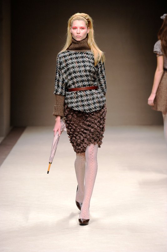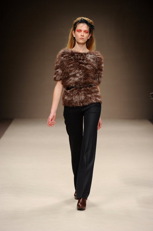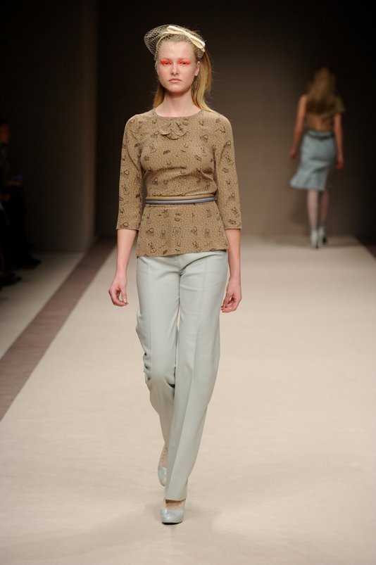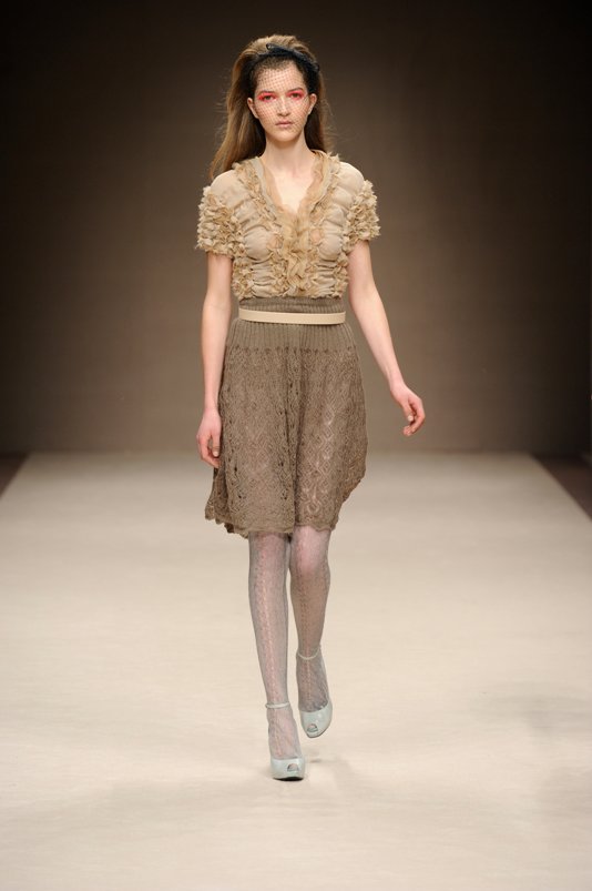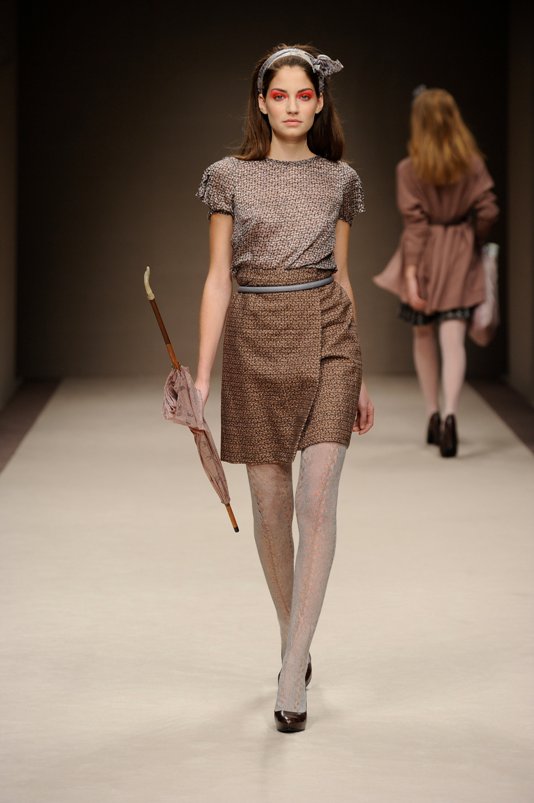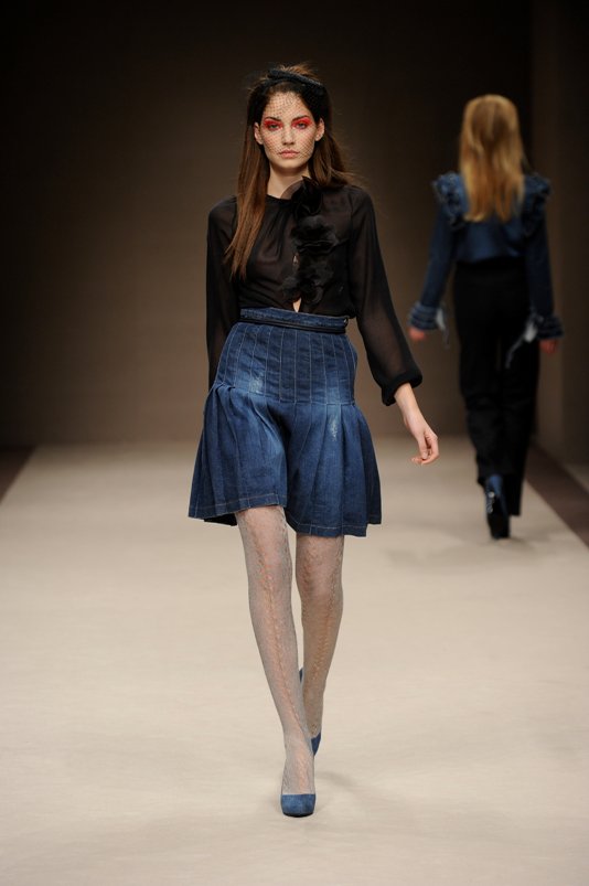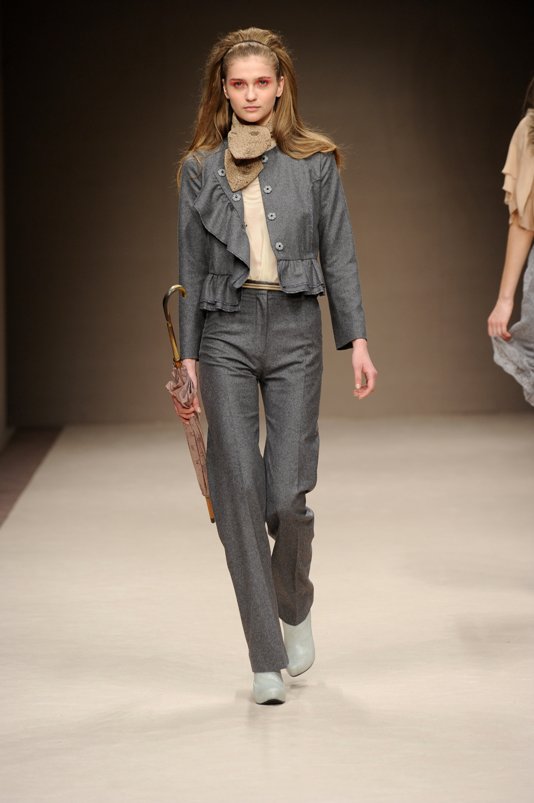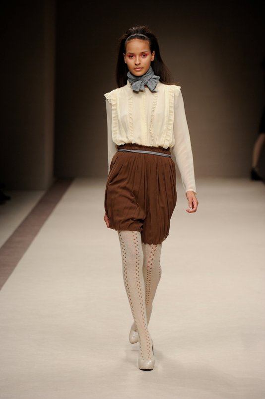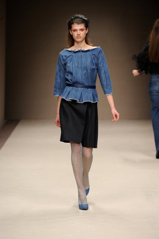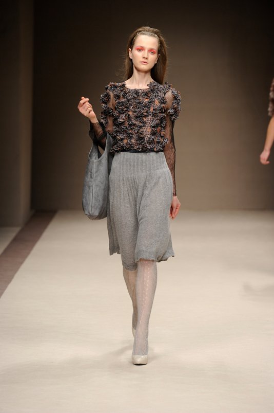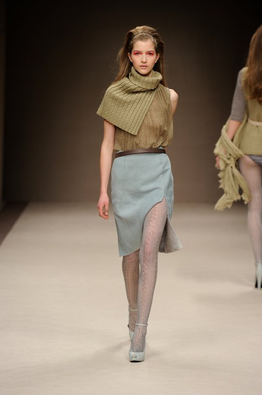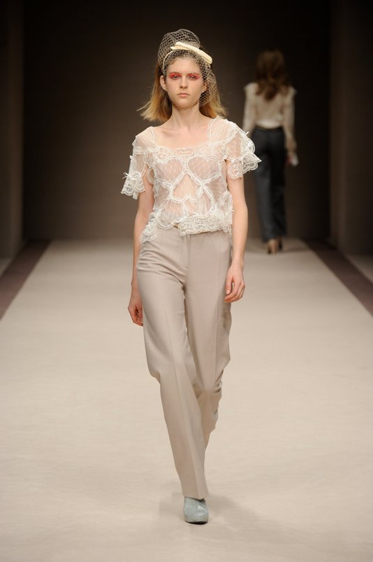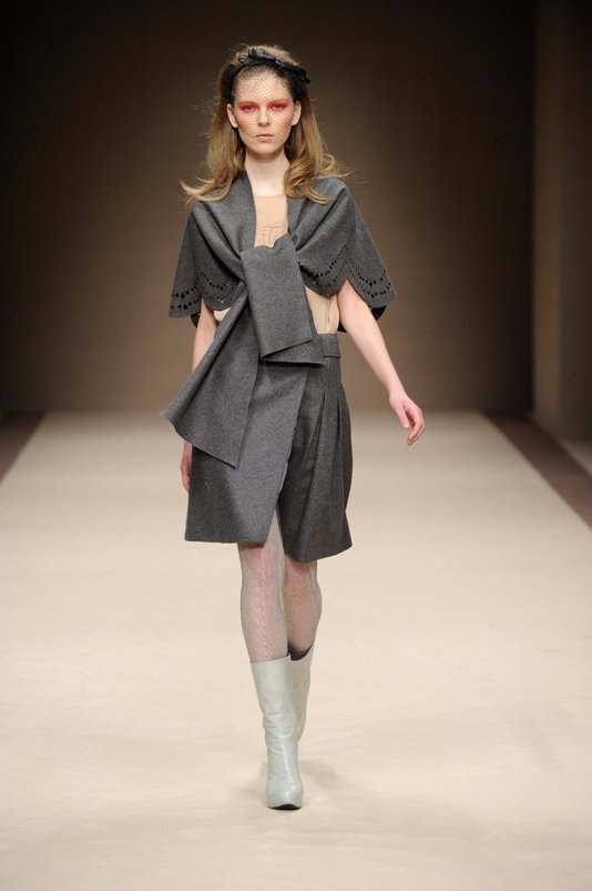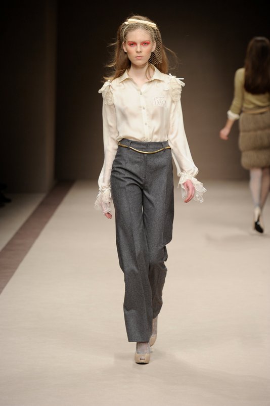 Cristina Tardito, in arte Kristina Ti, per la sua nuova collezione autunno/inverno 2011-2012, ha presentato sulla passerella del Museo della Permanente, la “signorina snob” reinventata in chiave moderna con lo stile autoironico e la leggerezza lieve e spiritosa di Franca Valeri. È Franca Valeri la signorina snob per eccellenza di tutti i tempi con quell’autentico spirito milanese e borghese che le appartiene da sempre e che ispira la designer torinese per la prossima stagione. Il mondo della Tardito è leggero ma non superficiale per una moda minimal ma sempre molto chic. Il suo stile prettamente femminile, è seducente, mai volgare ed è sicuramente il risultato di un ampio studio sull’intimo. La ricerca di questo modo d’essere femminile sobrio ma chic è reinventato nella nuova collezione con un’eleganza che ci riporta agli anni del boom economico quando le giovanissime esprimevano se stesse liberamente facendo scalpore. Grigio rosa beige e azzurro sono i colori scelti dalla stilista, la “testolina della donna buffa e snob” della Tardito è in perfetta sintonia con una Milano raffinata ma uggiosa; gli accessori pertanto diventano ombrelli, cappelli con velette nere a coprire il volto e giornali accartocciati in borsa. Le gonne in lanetta sono leggere e si fermano al ginocchio; qualcuna si apre a portafoglio, in altre i tagli creano spacchi profondi che lasciano più spazio al dettaglio della calza in pizzo di lana. Le camicette in seta sono leggere e trasparenti con applicazioni di cuori o rouge e stampe in madras che si ripetono, qualche volta, anche nelle scarpe. Il tailleur è in maglia con fiori applicati ed è simile la proposta per l’abito da sera, rigorosamente nero o con stampe in madras. Negli ultimi outfit la stilista propone qualche capo in jeans indumento per eccellenza degli anni della ripresa economica reinventati e resi più chic dalla vita alta per la gonna e per il pantalone e dallo scollo a barca per la casacca.