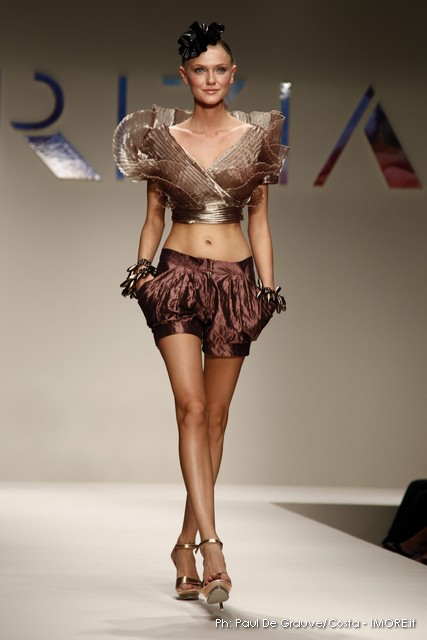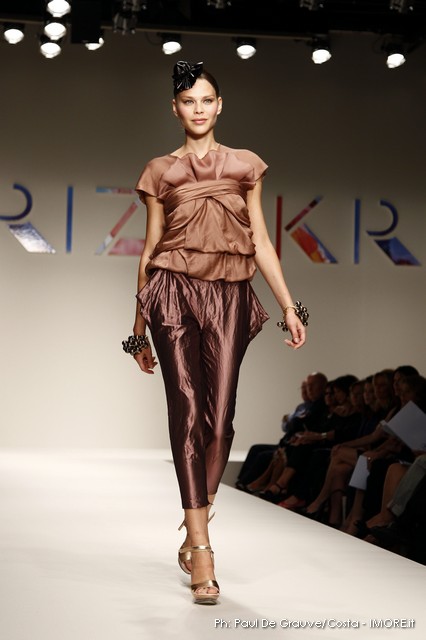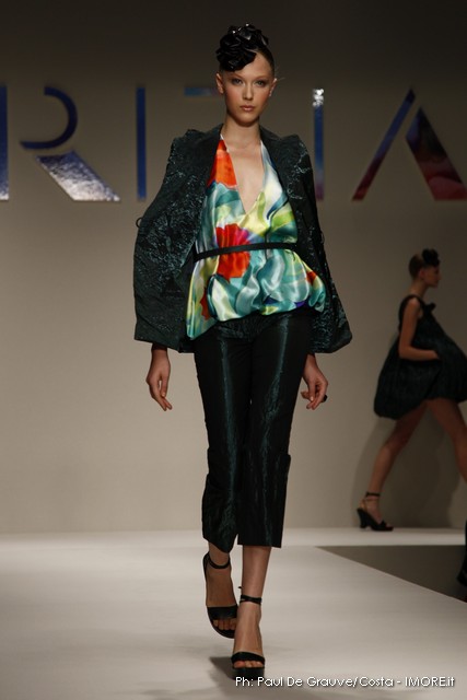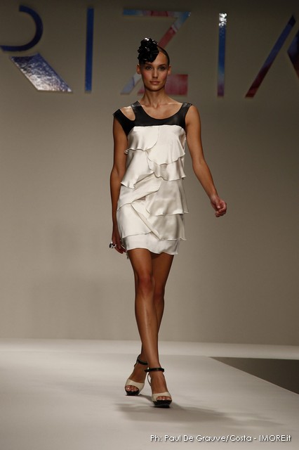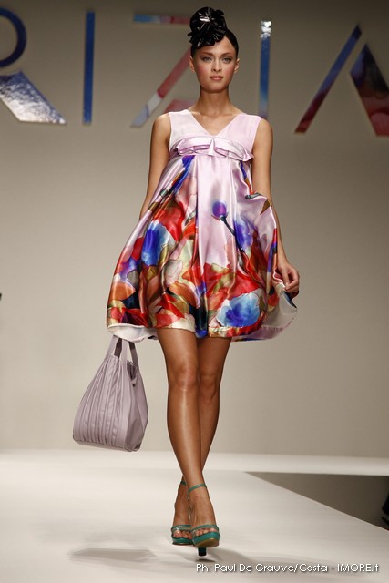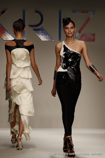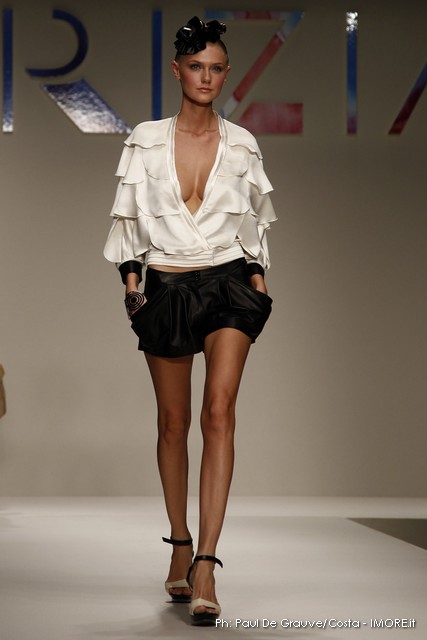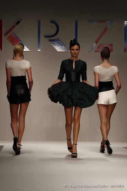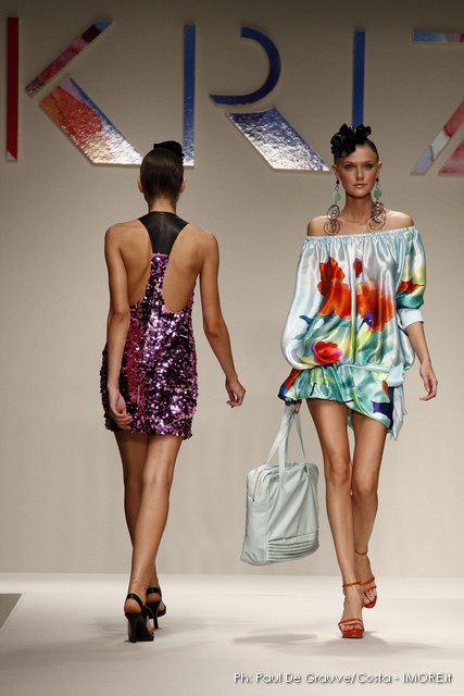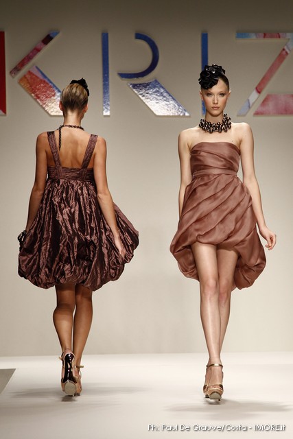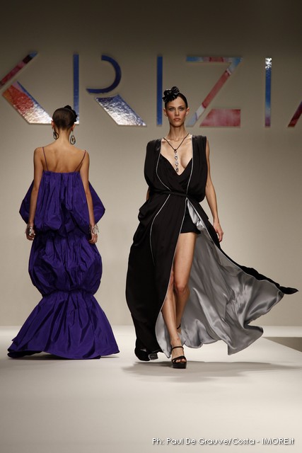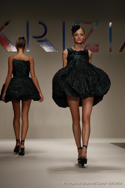 Strani contrasti produce la vena artistica di Mariuccia Mandelli, sempre protesa verso una creatività innovativa che genera lavorazioni nuove e preziose. In un momento difficile, Krizia presenta un’esplosione di colori che mettono allegria, coniugati in miniabiti e le bluse dai grandi fiori dipinti ad acquarello. La collezione non sembra soffrire la crisi, è senza risparmio, nei tessuti, nei materiali, nei dettagli, ma ciò è segno che gli stilisti del Made in Italy continuano a puntare sulla creatività, innovazione e qualità come elementi vincenti e fattori di distinzione di ciò che la moda italiana produce.