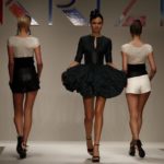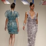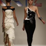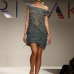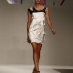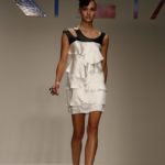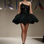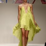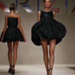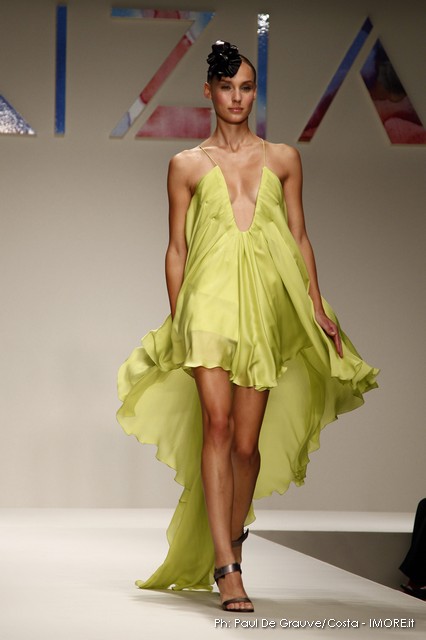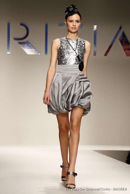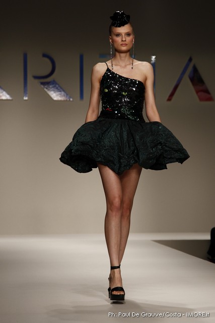 Abitini corti, cortissimi, variazioni su un unico tema, in un bellissimo verde bottiglia, gonfi quasi un tu-tu e non sai come la stoffa possa rimanere rigida; ci si immagina una armatura… ma non è detto. Corti a palloncino dove il drappeggio forma il volume e rende la gonna quasi un bocciolo. Corti con balze di cady. Cortissimi illuminati da paillets nei colori accesi della paletta verde lime, glicine, verde bottiglia.