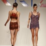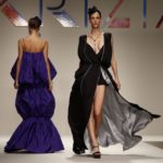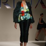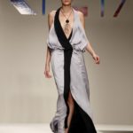 Poi il pantalone si allunga a diventare pinocchietto ed è coniugato con sottogiacca a stampa pantera in nero o in caramello. Anche gli abiti diventano lunghi e capovolgono le leggi della gravità, il plissè va verso l’alto negli abiti da sera corto e lungo ed è una alchimia fisica mantenerlo in piedi.