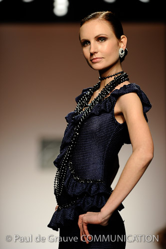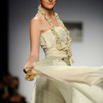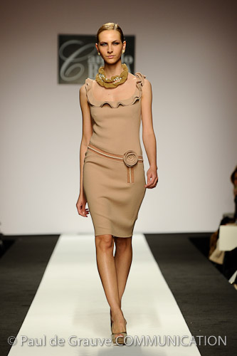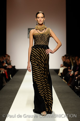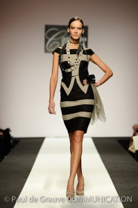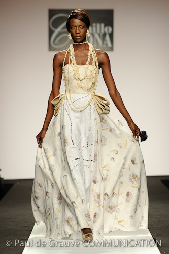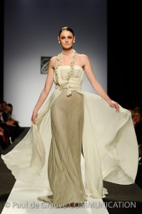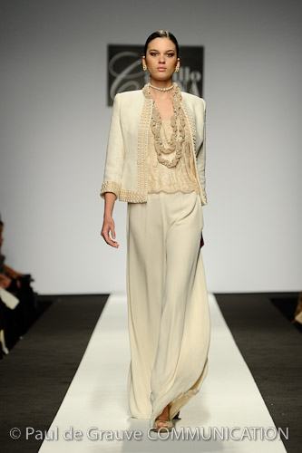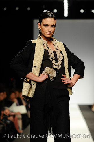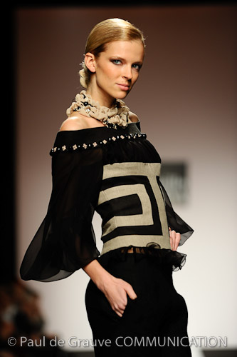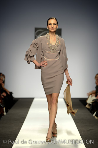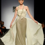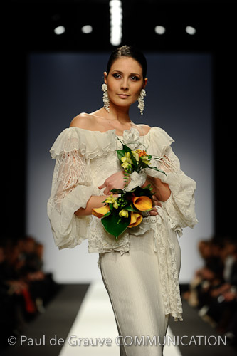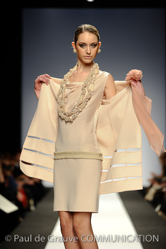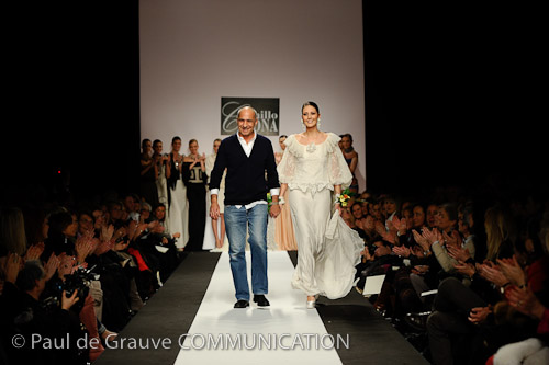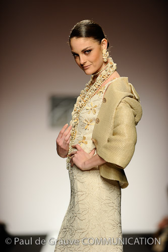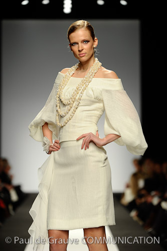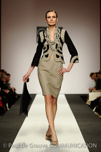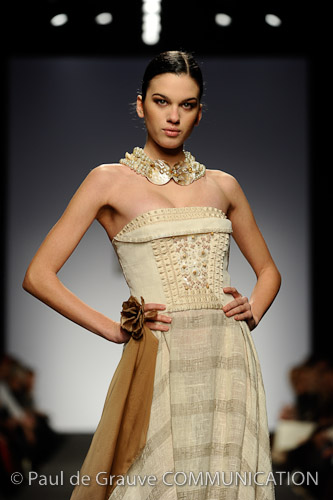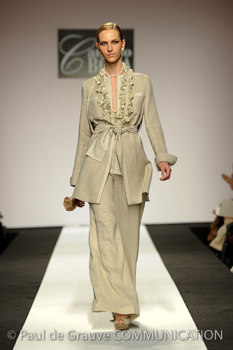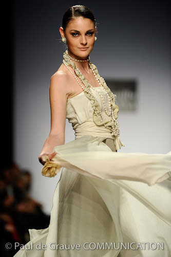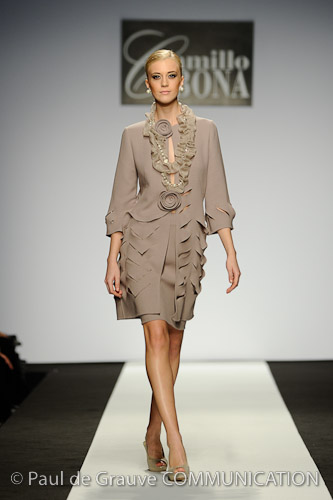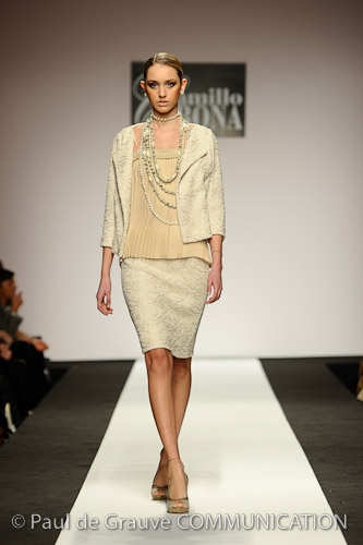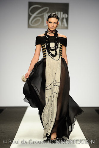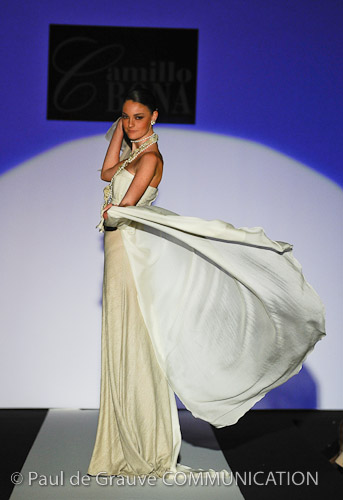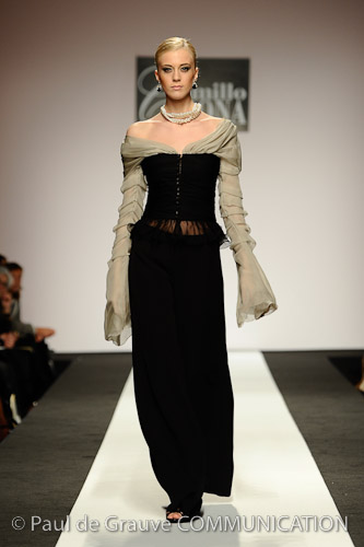 Non è da tutti coniugare nella silhouette di un abito il rigore della struttura e la capacità di suggerire portabilità e leggerezza, ci è riuscito Camillo Bona. Tagli improntati a una sartorialità rigorosa, intarsi e giochi bicolore uniti a silhouette contemporaneamente strutturate e fluide, caratterizzano la collezione primavera-estate 2011 dello stilista, che ha portato sulla passerella romana un’Alta Moda sobria ed elegante, ricca di citazioni, che rivisita spunti estetici e attinge suggestioni dalle tele di Velazquez. La donna di Camillo Bona è decisamente chic e bon ton, il corpo è avvolto da stoffe fluttuanti senza che gli abiti indulgano in eccessi stilistici o manierismi barocchi.