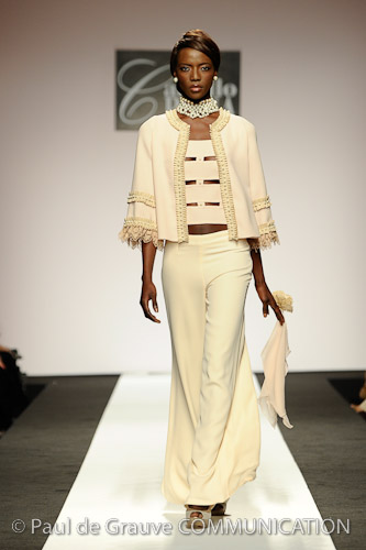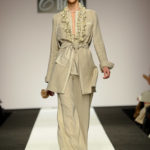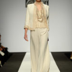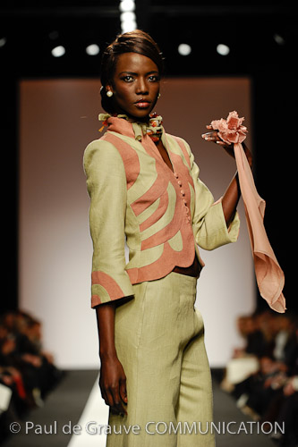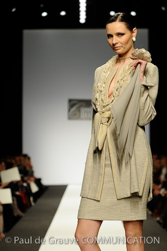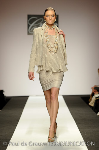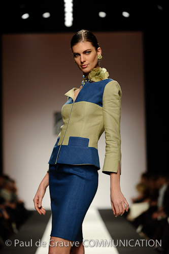La scelta dei tessuti e l’essenzialità della palette cromatica sono complici del dualismo che caratterizza la collezione. Crépe di lana double e lino, seta e rafia vestono il giorno. La sera predilige le sete ed il jersey, non rinunciando ad un uso raffinato della maglia e del lino. Prevalgono nuances neutre come sabbia, corda e marrone, sfilano ovviamente il bianco ed il nero, si aggiungono flash di rosa antico, blu e turchese. Petite robes, tailleurs e completi pantalone sono caratterizzati da geometrie e dettagli sartoriali simmetrici. Di tanto in tanto tubini e giacche sono decorate con ruches e roselline leggere, che si posano sulla vita, sulle maniche, sulle scollature.
