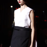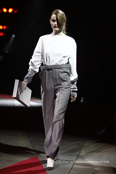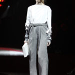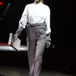 La ricerca delle forme parte dai pantaloni, dai tagli loose, segnati da profonde pinces, dove il focus diventa la vita che, oltre ad essere alta, non poggia sul corpo e sembra quasi sospesa, sostenuta dalla cintura. La silhouette diventa così cilindrica e rigida.
