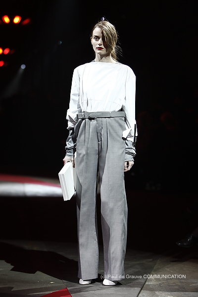 In coerenza con il suo stile, la maison va contro tendenza rispetto ai trend già visti in passerella: allora il focus di questa collezione si sposta dalle spalle alle maniche che, incurvate nella parte posteriore, sembrano quasi formare delle ali sulle camice.