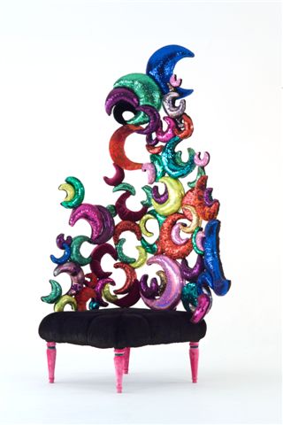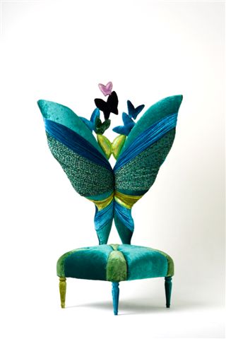 Carla resta comunque la chair-lady, “ideologa” dell’oggetto utile&banale che può farsi arte se a colorarlo, strutturarlo, ornando, vestirlo provvede uno spirito creativo come il suo. Lei stessa, infatti, “confeziona” le sue opere, selezionando tessuti, colori, paillettes, pattern, che poi lavora di persona ricamandoli e decorandoli con la passamaneria.