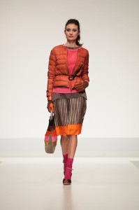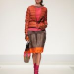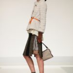 Il capo attorno a cui ruota l’intera collezione è senza dubbio la gonna: è tinta unita o in stampe optical, in seta leggera oppure in pesanti tessuti dai fitti intrecci. Anche gli abiti danno l’illusione di indossare un top e una gonna. La maison la propone abbinata a piumini ultraleggeri – in due lunghezze – dai colori fluo come il fuxia o l’arancio, oppure accostata a cappottini delicati dai colori più neutri. Una costante: la micro-cintura in pelle indossata sempre (su cardigan, pull, cappotti e piumini) per segnare il punto vita. A completare il look gambe nude e tronchetti o decolté da indossare rigorosamente con il calzino maschile a costine in vista.