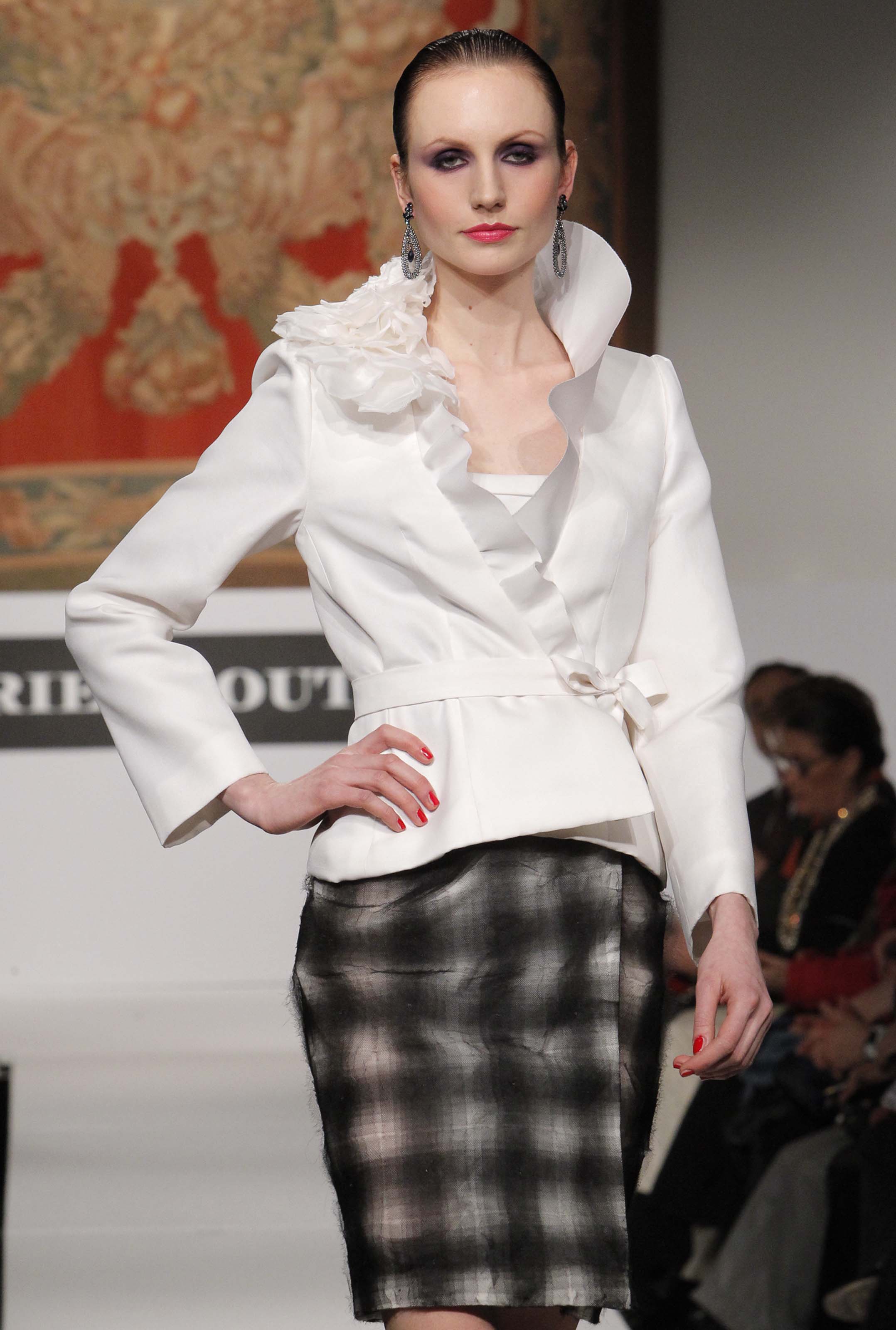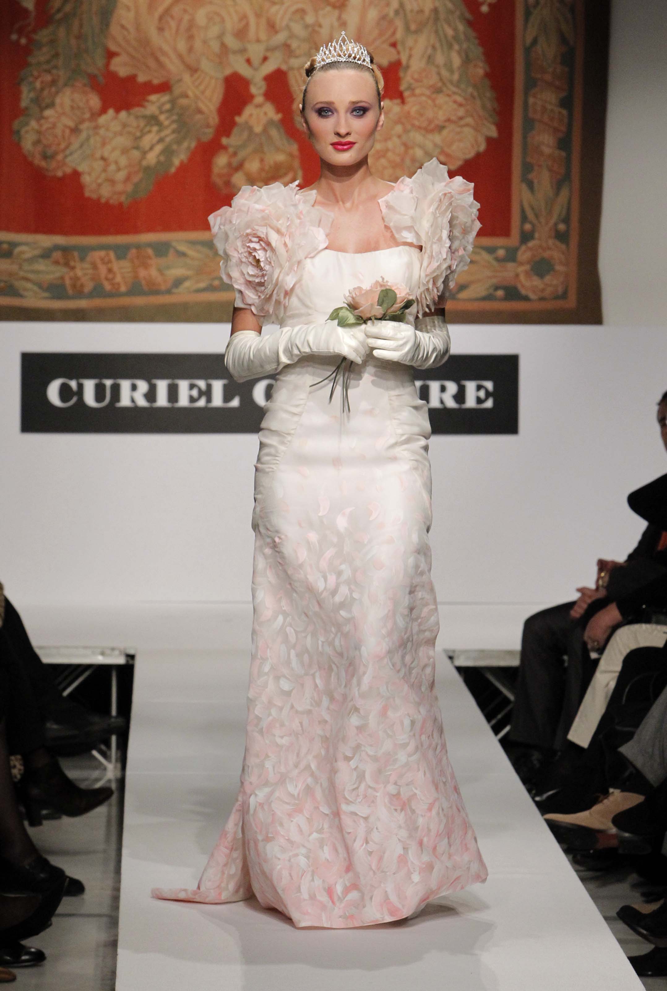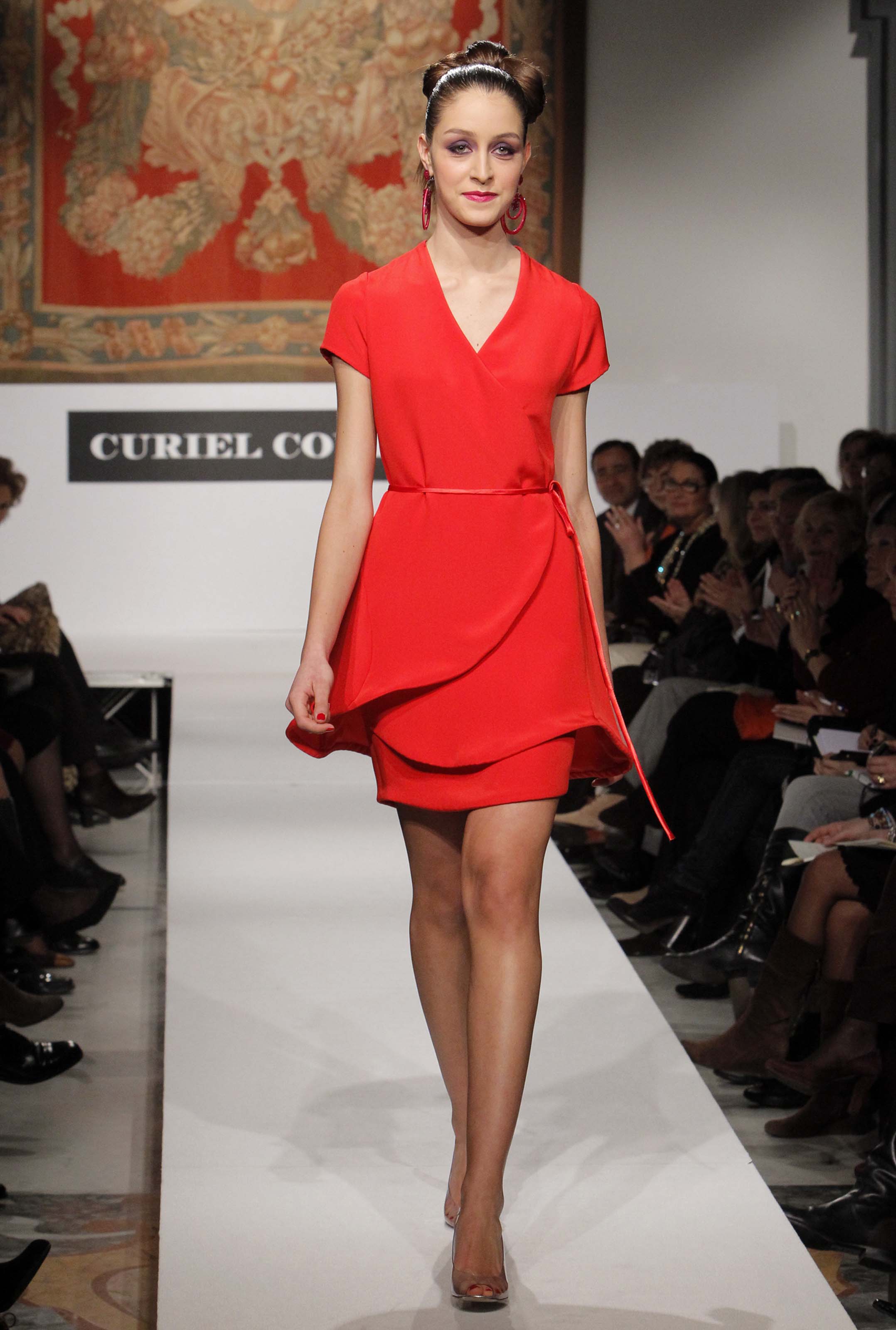 Ritorna a Roma, come lei stessa dice dalla porta principale, in una location prestigiosa messa a disposizione dal primo cittadino. Di rimando la stilista dedica uno dei suoi abiti a Isabella Rauti moglie di Alemanno: rosso è l’abito e rosso è il mazzo di rose che la modella che lo indossa offre alla first lady della capitale. Gli scambi non finiscono qui. A fine presentazione quando la Curiel percorre la passerella per i meritati applausi il sindaco si fa avanti con una medaglia d’argento e fiori per la stilista che replica quindi, ma certamente non è nuova a premi e onorificenze italiane ed internazionali, il premio alla Carriera del Comune di Roma ricevuto nel 2006 dopo aver sfilato sempre al Campidoglio.