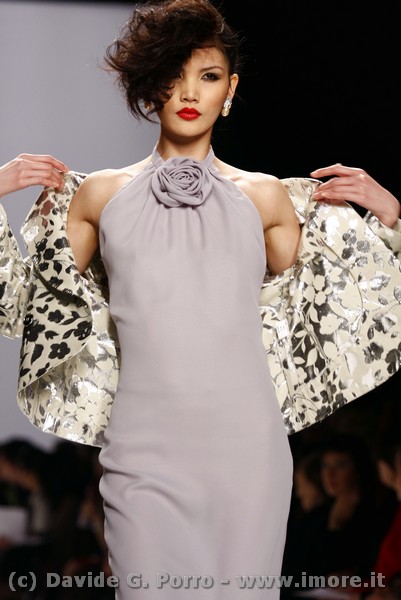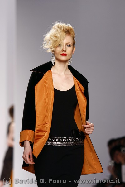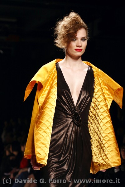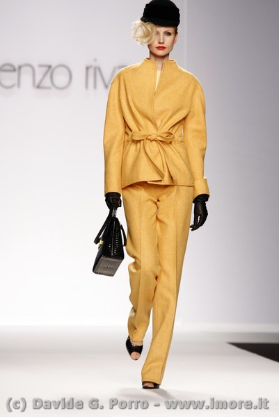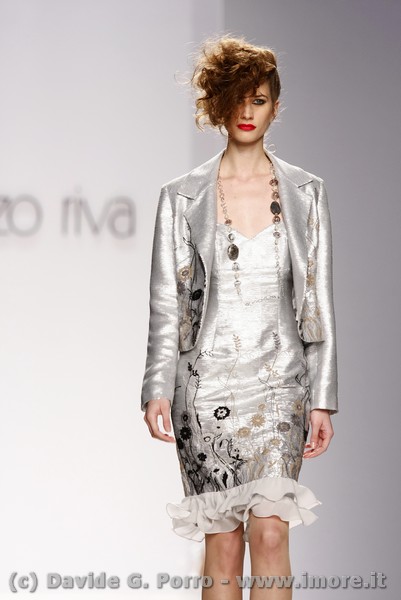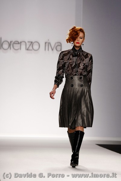 Allure dandy per la collezione pret-à-porter di Lorenzo Riva a/i 2009/2010: un carattere deciso per il giorno, un incanto vittoriano per la sera. Doppio registro quindi nella sua collezione. Il mattino rispecchia la tradizione sartoriale dello stile Riva che costruisce una donna dall’eleganza accuratissima ma comunque severa e sobria nell’insieme. Per la sera lo stilista, senza sottrarre nulla alla sua esperienza di grande couturier, sceglie una rappresentazione femminile più disinvolta, di una donna che mira a sedurre con l’abito e con il corpo.