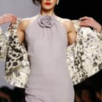 Si passa dai completi in panno di lana crème con tocchi di maculato ai tessuti setosi e luccicanti, dai pizzi chantilly agli abiti da mezza sera in velluto con inserti di raso lucido.