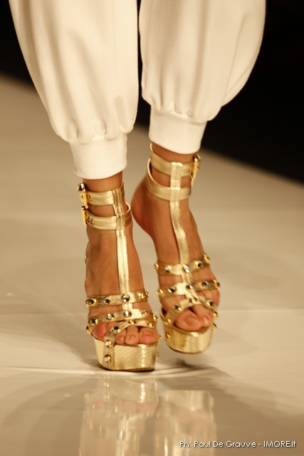 Nulla deve passare inosservato, ogni dettaglio deve accentuare la forza magnetica della donna e negli accessori vince così l’oro: bracciali grossi o serpentati, lunghe collane voluminose, borchie o tracolle dorate per le borse, svettanti sandali d’oro si arrampicano sulle caviglie. Le modelle poi, forse sempre per non oscurare ciò che indossano, portano tutte i capelli tirati e stretti in un’alta coda di cavallo.