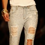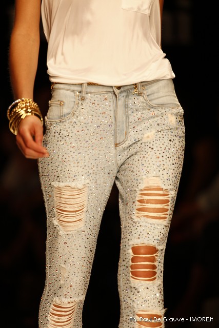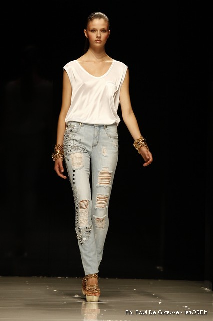 La donna di Angelo Marani si sente bella e vuole trasmetterlo scoprendo le gambe con piccoli shorts di denim délavé tempestati di cristalli o micro paillettes, ricoprendosi di gioielli anche sui jeans affusolati e lacerati o sulle felpe lavorate e decorate con borchie dorate.