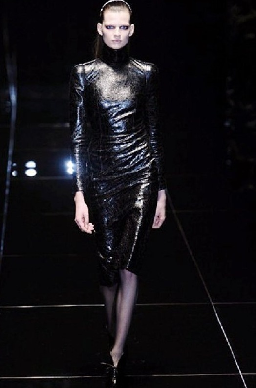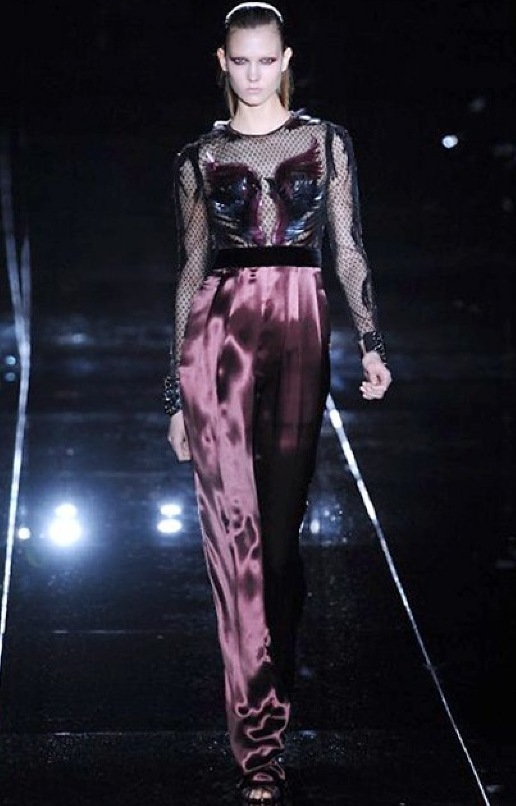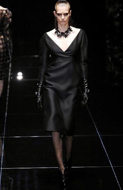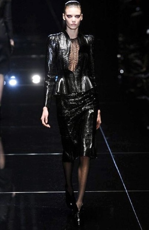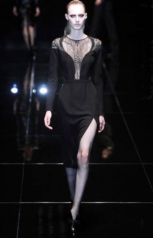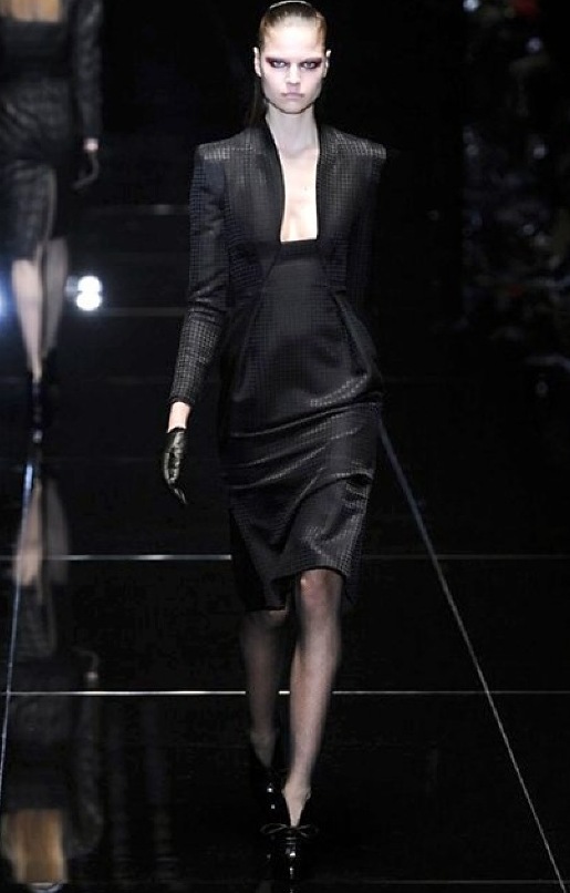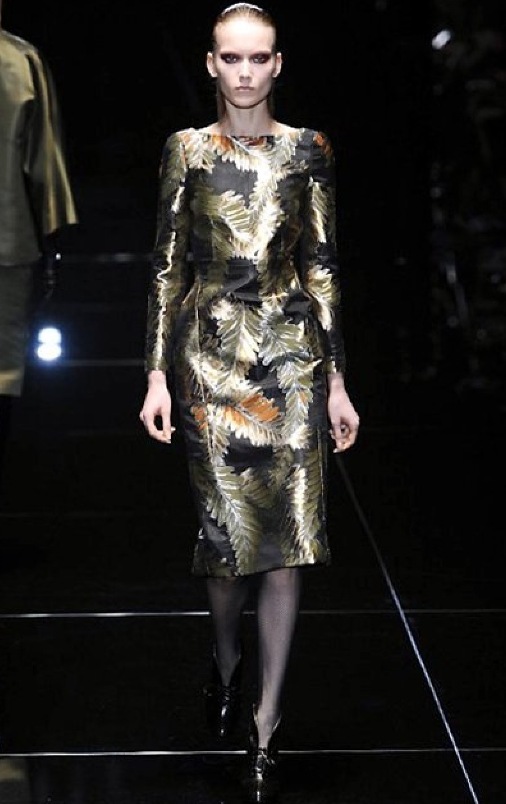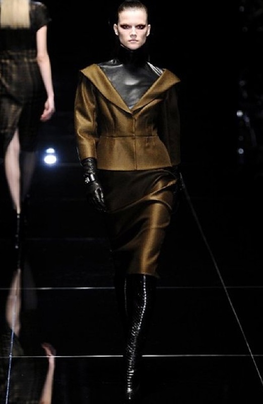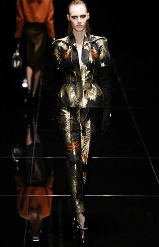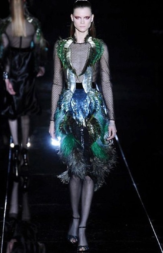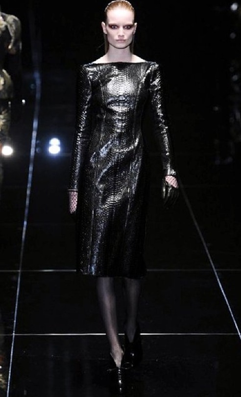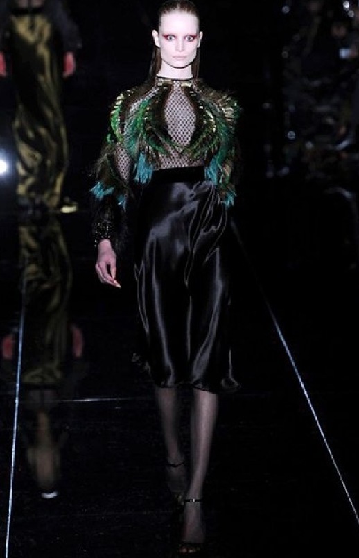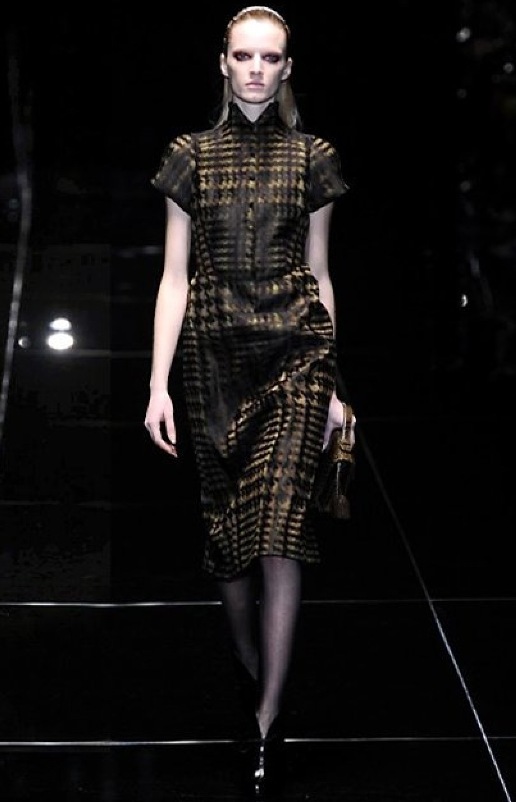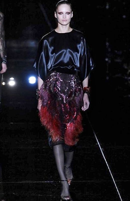 Si respira un’aria diversa dalle altre sfilate: la donna è altera, irraggiungibile, elegantemente impeccabile non si fa mancare nulla nel suo vasto guardaroba: abiti audacemente retati ricoperti da ali di piume un po’ troppo cinematografici, guanti da Eva Kant, lupetti in pelle accollatissimi, collant con la riga nera dietro al polpaccio, stiletti vertiginosi, stampe di foglie verdi su attillati vestiti dalla schiena scoperta. I nuovi tailleur sono lussuosi e vagamente tribali, con spalle a uovo o bombate, le scollature profonde e gli spacchi inconsueti. Frida Giannini, a pochi giorni dal parto, non si è per nulla addolcita; la direttrice creativa della maison, ha creato infatti una dark lady dura e misteriosa, persino un po’ fetish, che indossa abiti dalle forme scultoree ed essenziali contaminandoli con dettagli estremi. Una femmina seduttiva che sa cosa vuole e quando lo vuole.