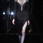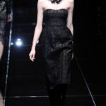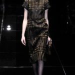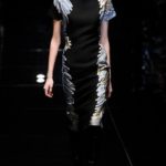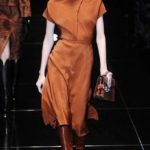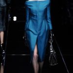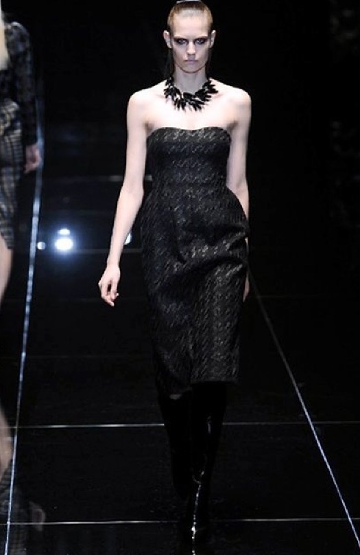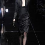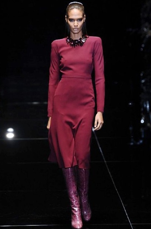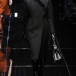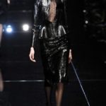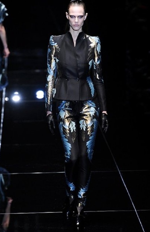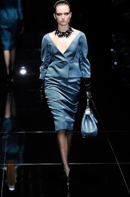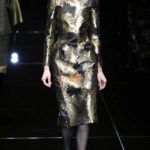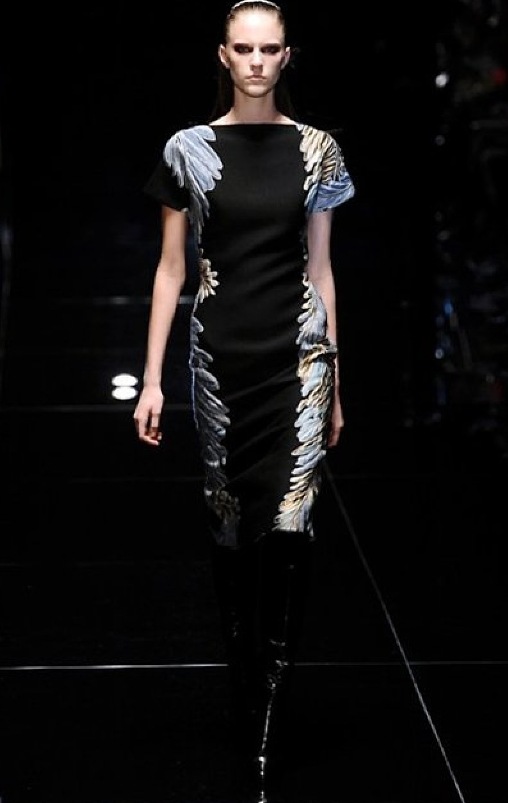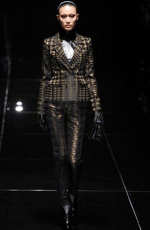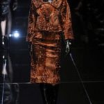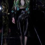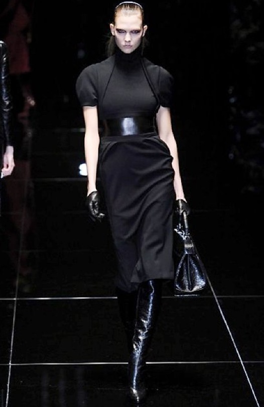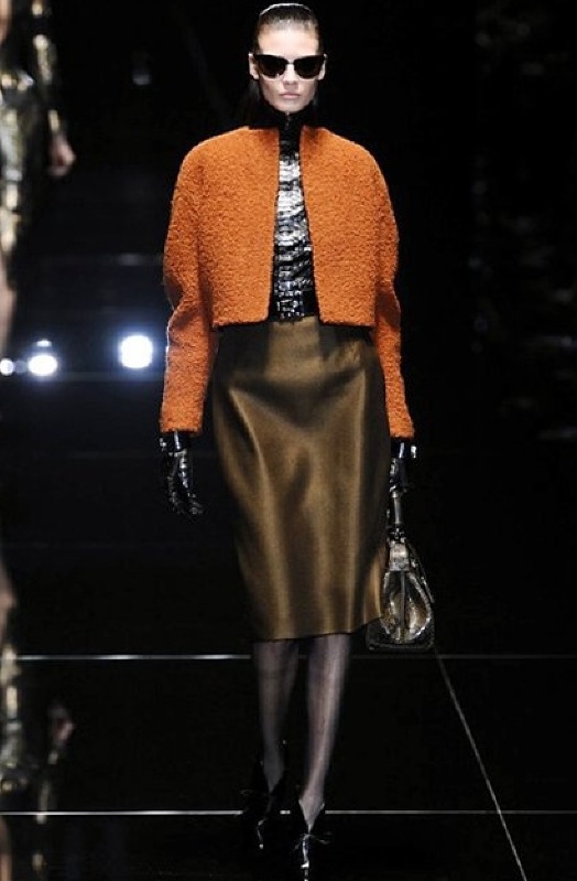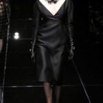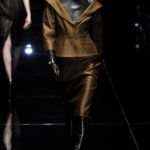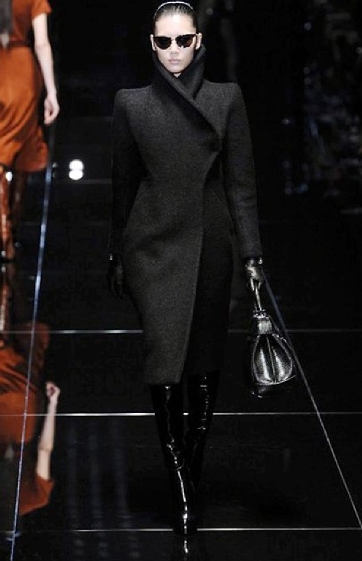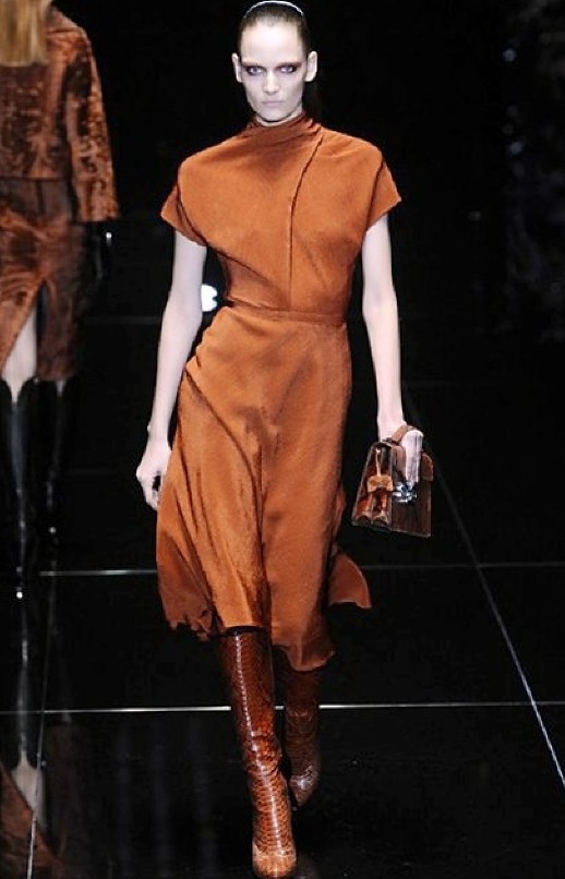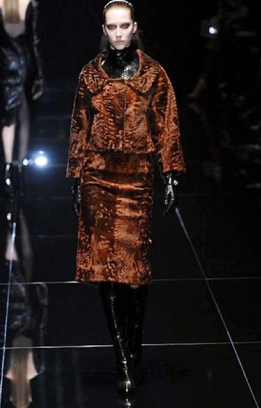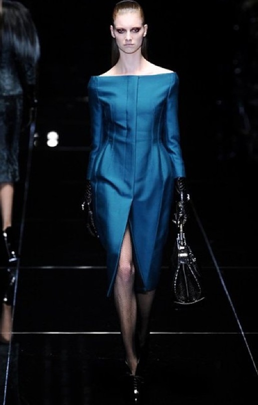 Si respira un’aria diversa dalle altre sfilate: la donna è altera, irraggiungibile, elegantemente impeccabile non si fa mancare nulla nel suo vasto guardaroba: abiti audacemente retati ricoperti da ali di piume un po’ troppo cinematografici, guanti da Eva Kant, lupetti in pelle accollatissimi, collant con la riga nera dietro al polpaccio, stiletti vertiginosi, stampe di foglie verdi su attillati vestiti dalla schiena scoperta. I nuovi tailleur sono lussuosi e vagamente tribali, con spalle a uovo o bombate, le scollature profonde e gli spacchi inconsueti. Frida Giannini, a pochi giorni dal parto, non si è per nulla addolcita; la direttrice creativa della maison, ha creato infatti una dark lady dura e misteriosa, persino un po’ fetish, che indossa abiti dalle forme scultoree ed essenziali contaminandoli con dettagli estremi. Una femmina seduttiva che sa cosa vuole e quando lo vuole.