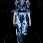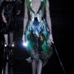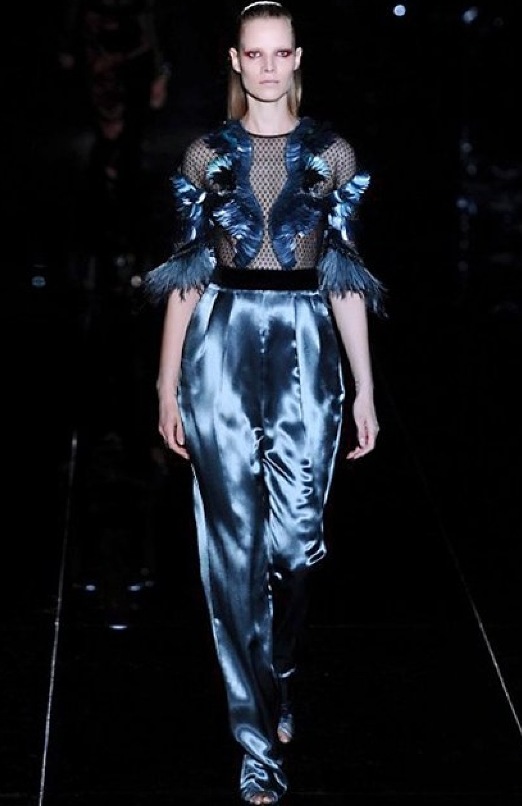 Gucci ci ha mostrato una donna determinata e femminile che sa come apparire e piacere, vuole essere comoda ma nello stesso tempo sciccosa; per questo di sera si ricopre di effetti speciali come le bluse in rete su cui s’incastrano piume iridescenti e ragnatele di pizzo.