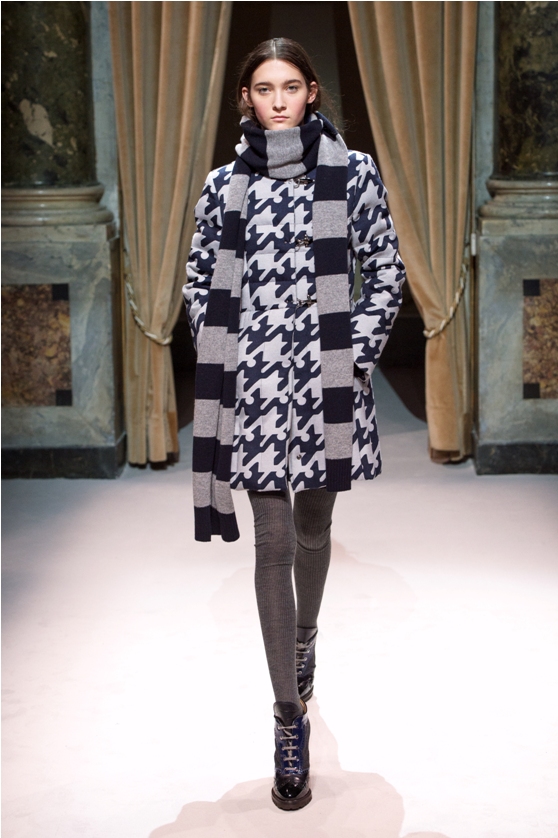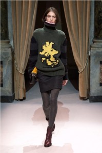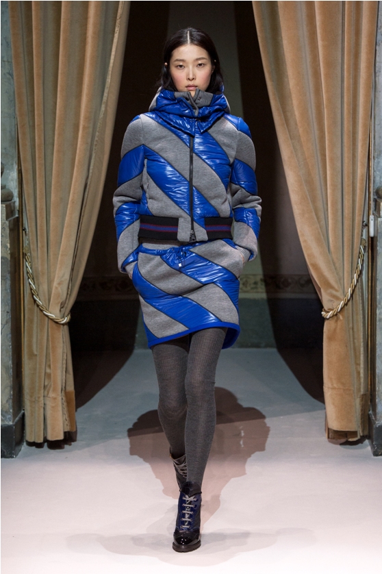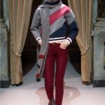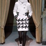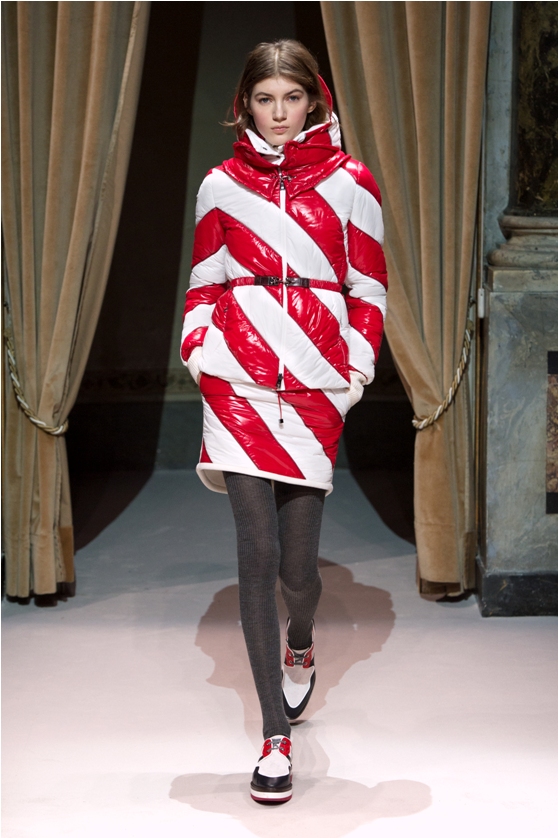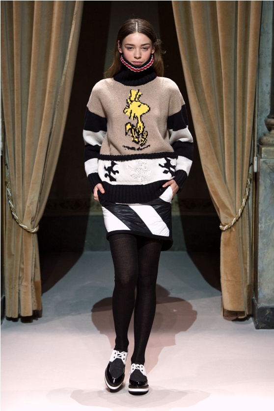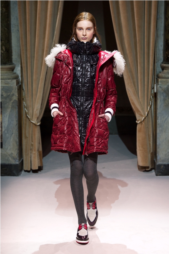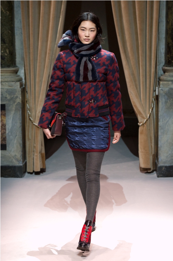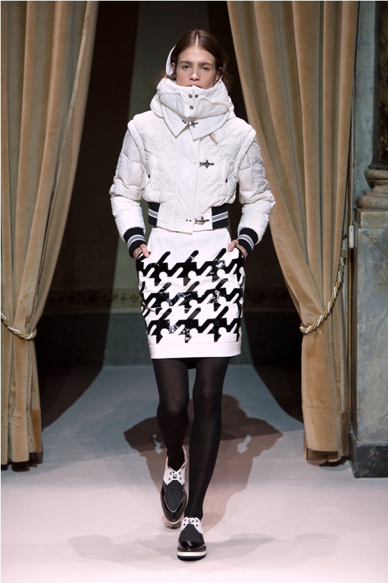 Un’altra parte della collezione ha una cifra stilistica, sempre giovanile, ma più cittadina: si tratta di un abbigliamento quotidiano dinamico, di qualità e per alcuni aspetti sofisticato. Ne sono prova le varianti del disegno pied de poule che ingrandito diventa un segno grafico inedito, la stilizzazione di uno sciatore, su maglioni, sciarpe o sulla vernice di un parka, su una gonna, su un piumino. Riprodotto, non in bianco e nero secondo la migliore tradizione della sua origine scozzese, ma grigio/nero, vinaccia/blu, nero tono su tono, perde il suo rigore e diventa un elemento moderno e dinamico.