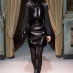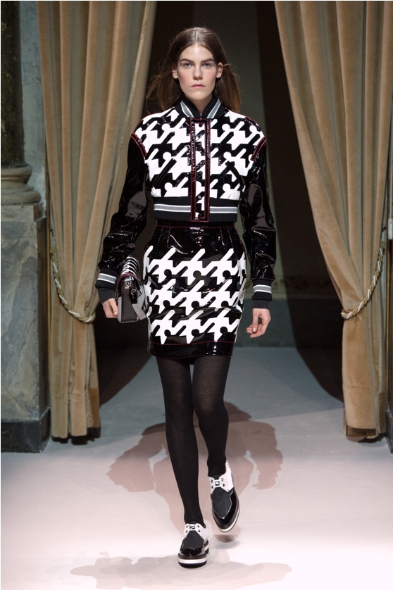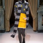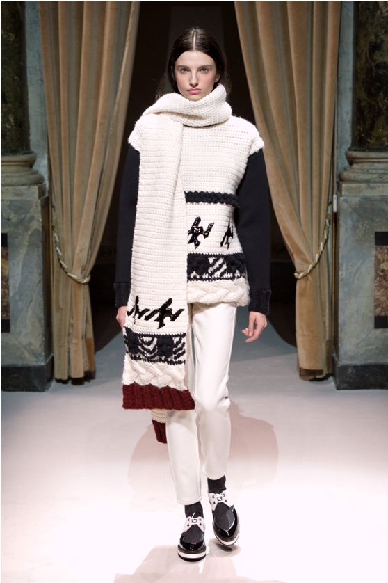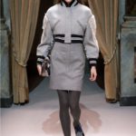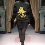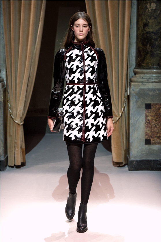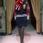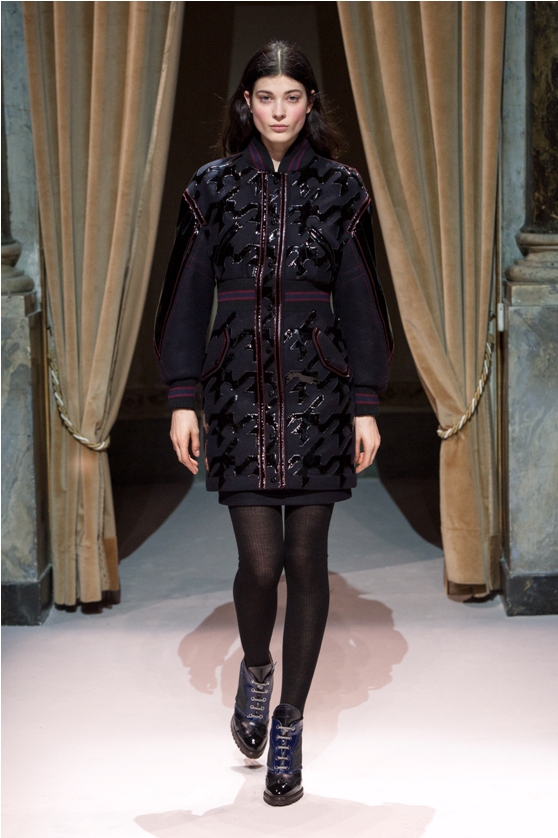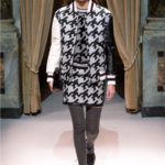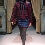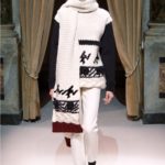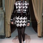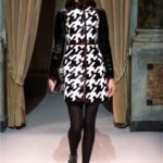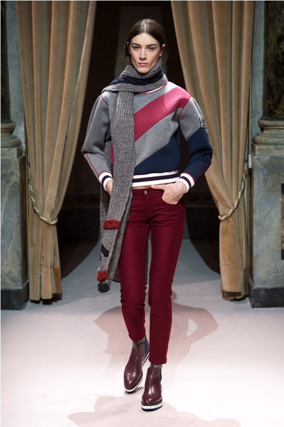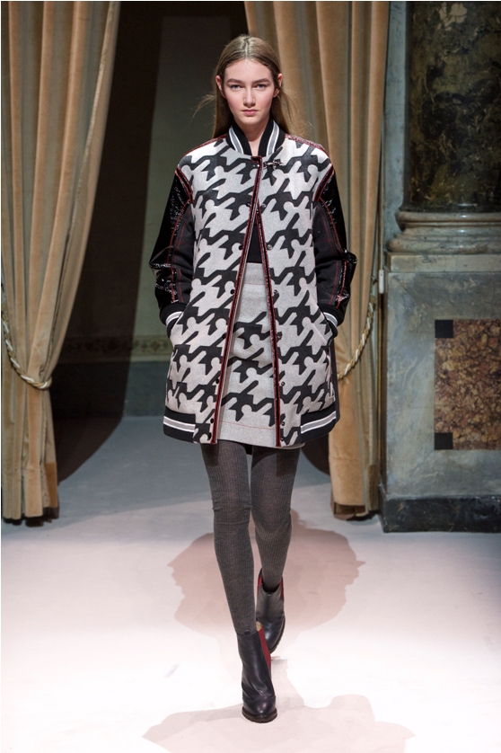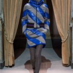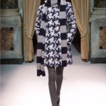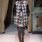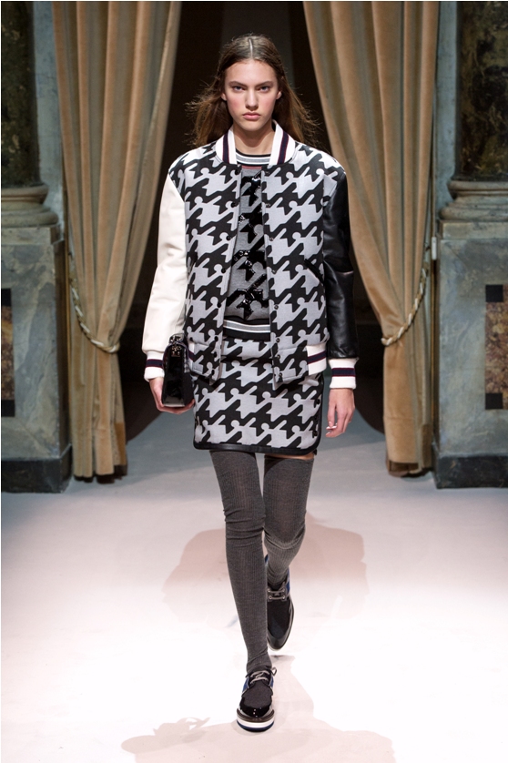 Un’altra parte della collezione ha una cifra stilistica, sempre giovanile, ma più cittadina: si tratta di un abbigliamento quotidiano dinamico, di qualità e per alcuni aspetti sofisticato. Ne sono prova le varianti del disegno pied de poule che ingrandito diventa un segno grafico inedito, la stilizzazione di uno sciatore, su maglioni, sciarpe o sulla vernice di un parka, su una gonna, su un piumino. Riprodotto, non in bianco e nero secondo la migliore tradizione della sua origine scozzese, ma grigio/nero, vinaccia/blu, nero tono su tono, perde il suo rigore e diventa un elemento moderno e dinamico.