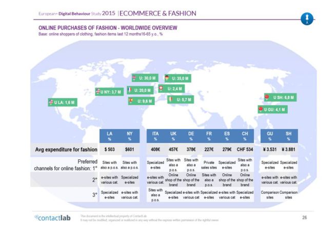 In generale la ricerca (free download su http://www.contactlab.com/it/risorsa-in-evidenza/edbs-ecommerce-and-fashion-2015-hybris-sap-contactlab/) ha evidenziato che tutta l’Europa sempre più spesso sceglie il fashion online ed i media sono al primo posto nell’influenzare le preferenze, mentre i primi driver di scelta pre-acquisto restano il sito web del marchio e la comunicazione via email.
