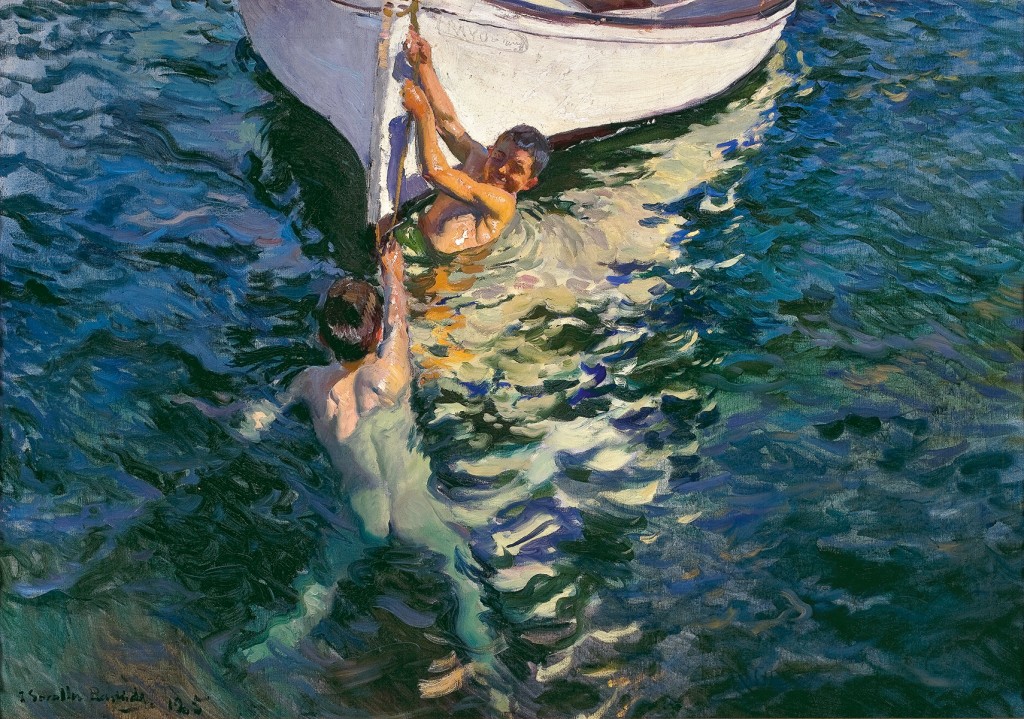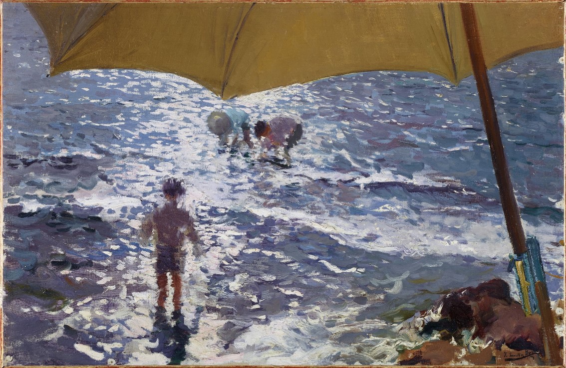 Quanti non conoscono Sorolla resteranno piacevolmente sorpresi e ammirati davanti alle sue tele che vibrano dei bagliori e dei caldi colori dell’estate, irradiando splendidi toni di bianco, rosa, violetto nel cielo e nell’acqua, nei giardini e sulla pelle femminile. In effetti sono le opere en plein air, dove Sorolla si fa esponente di un riuscito impressionismo mediterraneo, a mostrare la sua vena più profonda: i quadri dipinti davanti al mare, come Cosiendo la vela (1896), esposto alla Biennale nel 1905 e poi acquistato dalla città di Venezia, dove una famiglia di pescatori cuce una vela bianca; il Pescador del 1904; El bote blanco del 1905, o la donna che si cambia in un capanno del Después del baño. E poi la nostalgica e borghese Instantánea del 1906, dove Sorolla ritrae la moglie Clotilde, sua musa diletta, chic e affascinante in abito lungo e cappello, mentre sulla spiaggia di Biarritz aggiusta la lente di una macchina fotografica Kodak.
