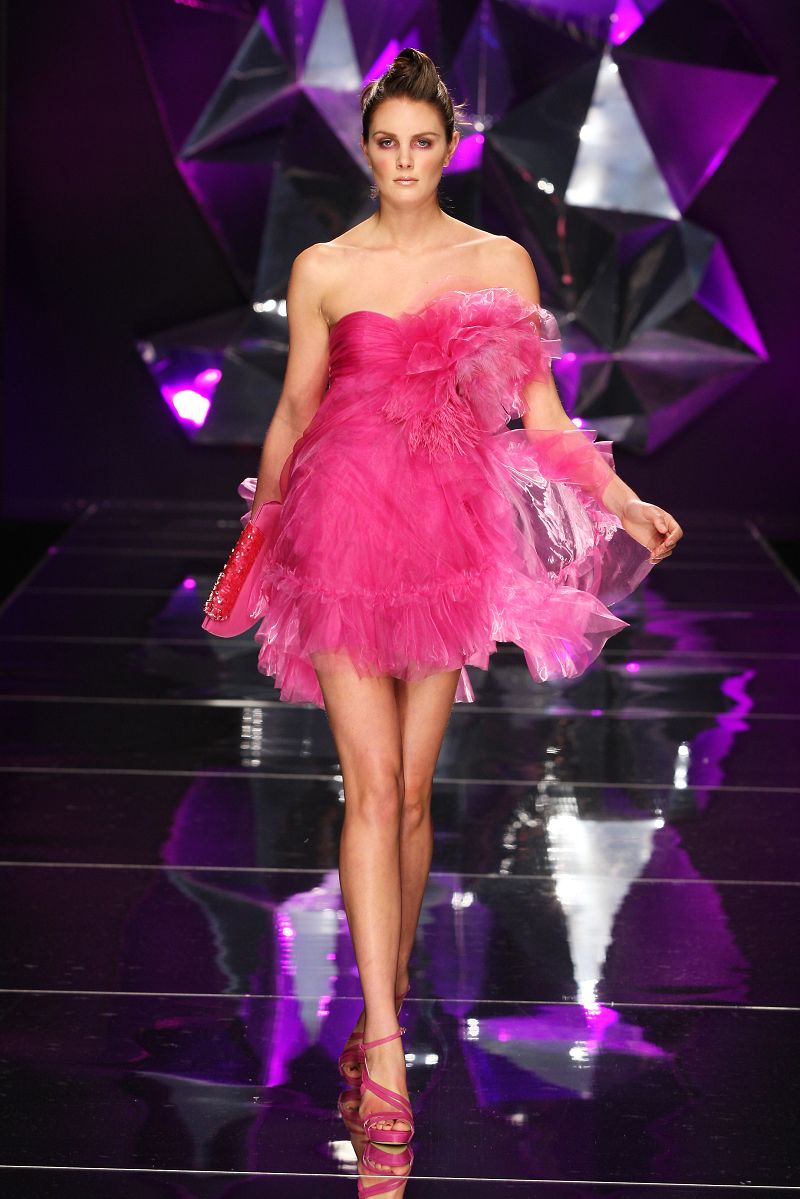 Questa stagione, oltre alle pitture su stoffa e agli Swarovski, gli abiti sono ornati di perle, di piume e di cuoio pitonato.