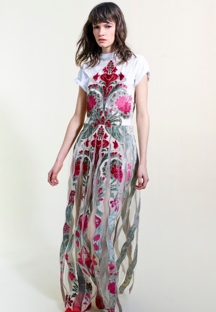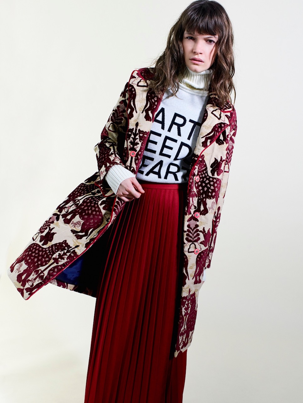 Musa dello stilista l’artista statunitense Kiki Smith, visionaria ed eclettica indagatrice del rapporto atavico tra esseri viventi e natura, con spiccato interesse verso il tema delle origini e della rinascita. Da lei, abile nel trasporre su arazzi, illustrazioni e sculture l’animo femminile, Guardini mutua la veemente passione per vestire una donna -collocata nel viaggio della propria storia- con pezzi realizzati in tessuti che vivono una seconda vita.