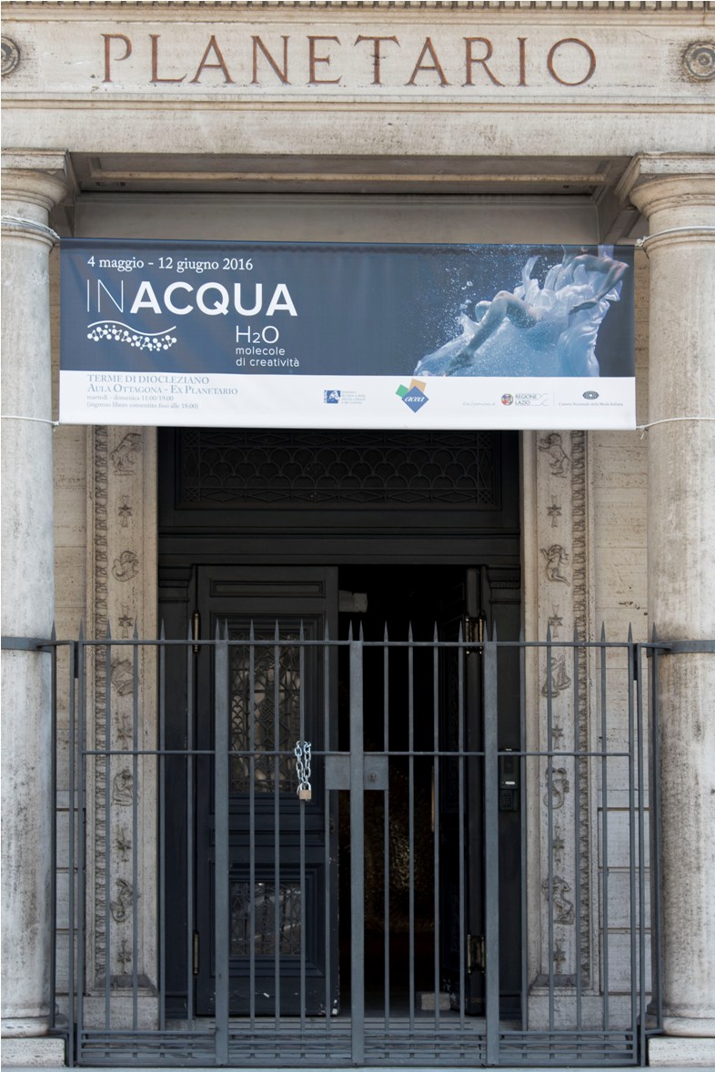 Una singolare mostra che rimarrà aperta sino al 12 giugno 2016 promossa da ACEA e curata da Stefano Dominella e Bonizza Giordani Aragno, dal titolo “In Acqua: H2O molecole di creatività”. Molecole di creatività incastonate in 63 abiti e 28 accessori per celebrare l’acqua nel luogo che probabilmente era un frigidarium, l’Aula Ottagona ex Planetario delle Terme di Diocleziano. Molti gli stilisti che si sono resi interpreti della simbologia dell’acqua attraverso la Moda: Guillermo Mariotto per Gattinoni, Laura Biagiotti, Giorgio Armani, Valentino, Gucci, Scervino, Ferré, ecc.