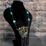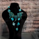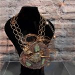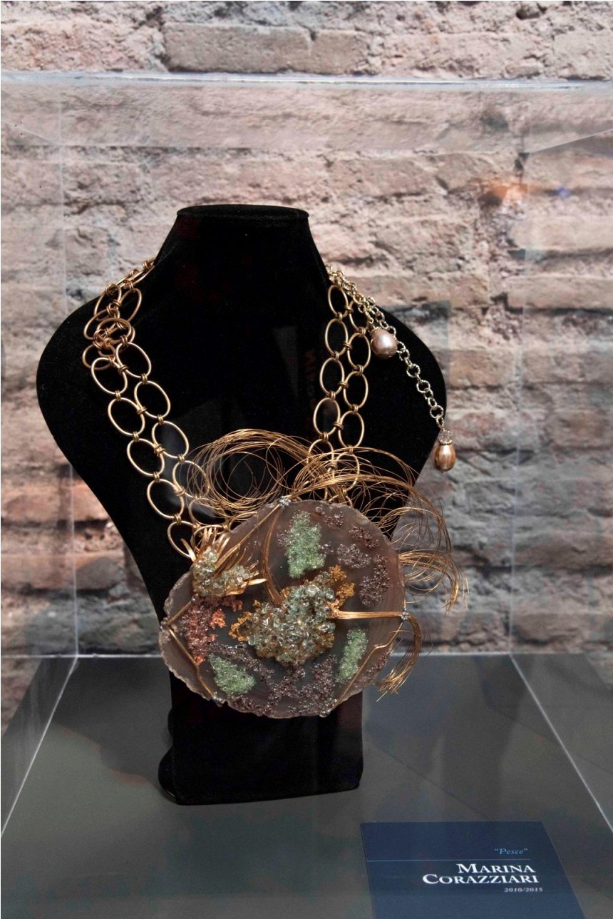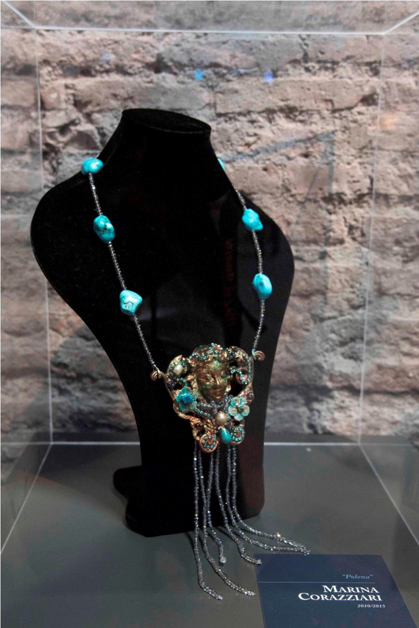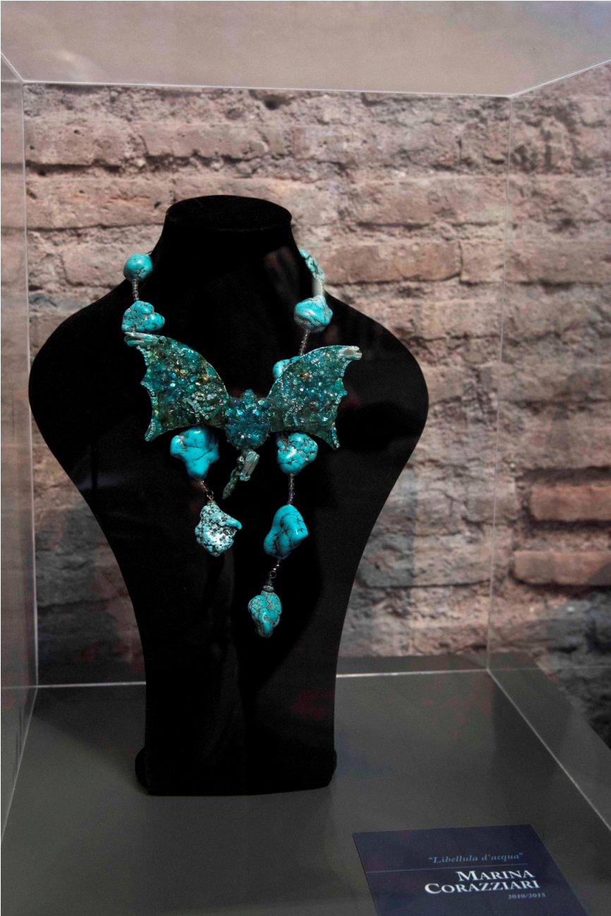 Marina Corazziari, che ha celebrato i suoi 30 anni di attività con un evento inserito nel Calendario di AltaRoma – Sezione “In Town” – Gennaio 2016, è presente con tre bellissime creazioni: Libellula d’acqua, Pesce, Polena. Si tratta di vere sculture – di fatto le sue opere possono essere chiamate gioielli sculture – , piccole opere d’arte, collane opulenti ed imponenti, da portare, a nostro parere, su abiti molto semplici, minimali, perché l’attenzione deve essere tutta sul gioiello; e non potrebbe essere diversamente! Uno stile eclettico quello dell’artista, che in queste tre opera dimostra di saper attingere a ispirazioni diverse. Accuratissima la lavorazione del metallo, come nella Polena dove riconosciamo una ispirazione barocca; sapientissima la distribuzione delle pietre per ottenere la scultura desiderata, come nella Libellula di sapore liberty; più moderna di sapore etnico appare l’opera Pesce per la stilizzazione nella descrizione del soggetto.