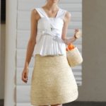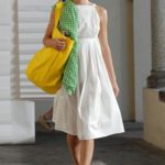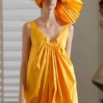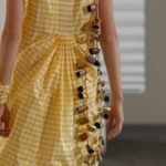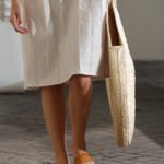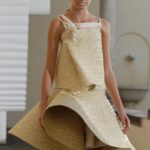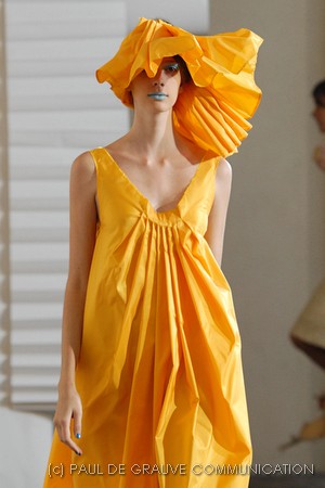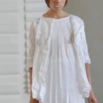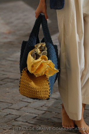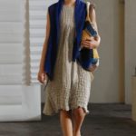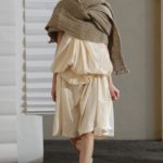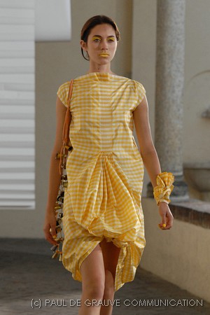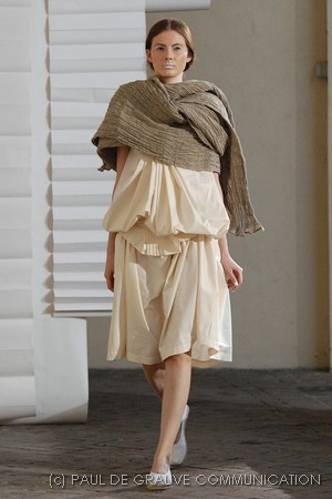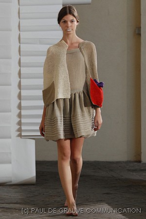 Le linee sono essenziali, la silhouette poco evidenziata, in un gioco di sovrapposizioni e chiaro scuri che donano alla figura un aspetto quasi fuori dal tempo e dallo spazio. Accessori scarni, ricavati dalla canapa e dal filo per collane, anelli e bracciali. Le borse sono grandi sacche in cotone, prevalentemente bianche con motivi geometrici in giallo paglierino.