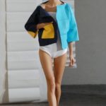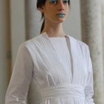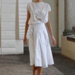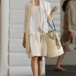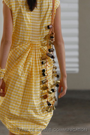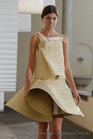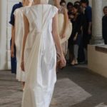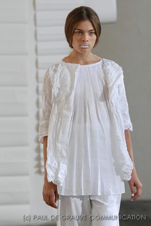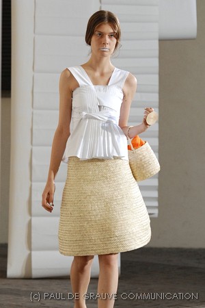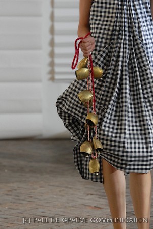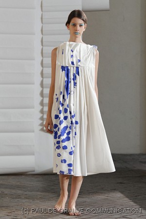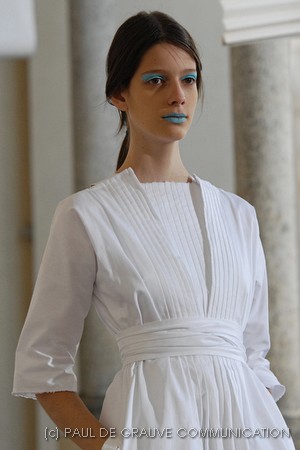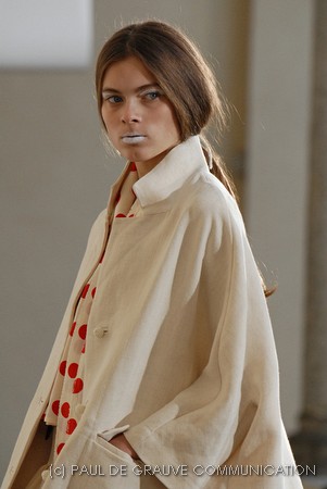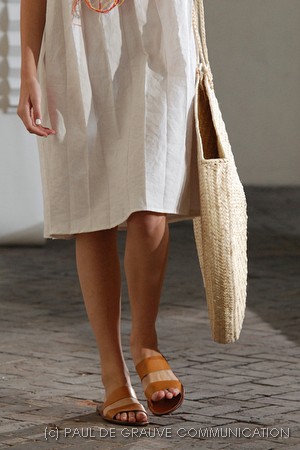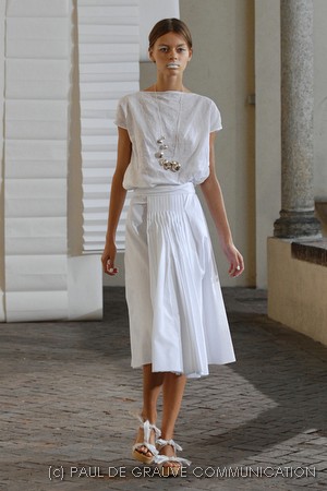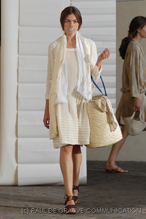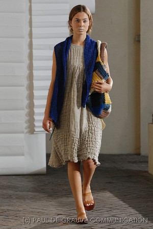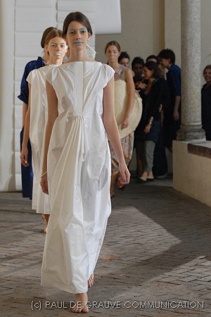 Cominciano ad entrare le modelle, passo lento e rigido, sguardo intenso, nessun movimento da top, labbra bianco intenso, palpebre lunari e piedi nudi. Il tessuto chiave è il lino, utilizzato per casacche, giacche, ampi pantaloni e gonnellone alla caviglia o a metà polpaccio. Poche le stampe, ad eccezione di grossi quadri bianchi e blu abbinati talvolta a sandali in legno, stretti al piede da lacci in cotone.