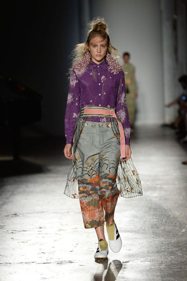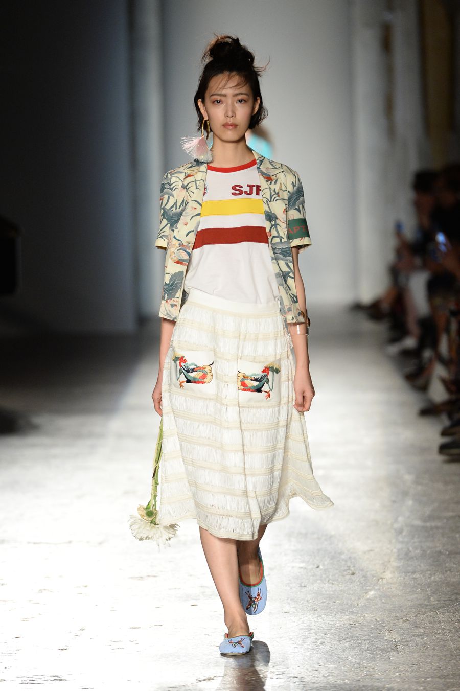 E’ un mondo trasversale e multiculturale quello che Stella Jean ha portato in passerella a Milano per la P/E 2017, un girotondo multietnico e multicolore, una corsa vorticosa sotto una pioggia di farfalle variopinte, un overdose di coriandoli, un oceano di cromie, un torrente di fresche fantasiose contaminazioni.