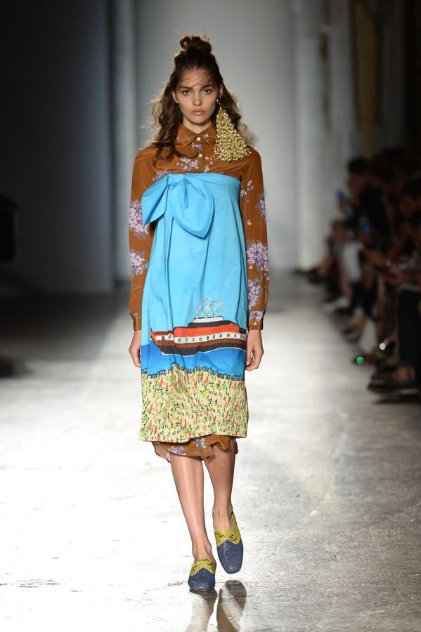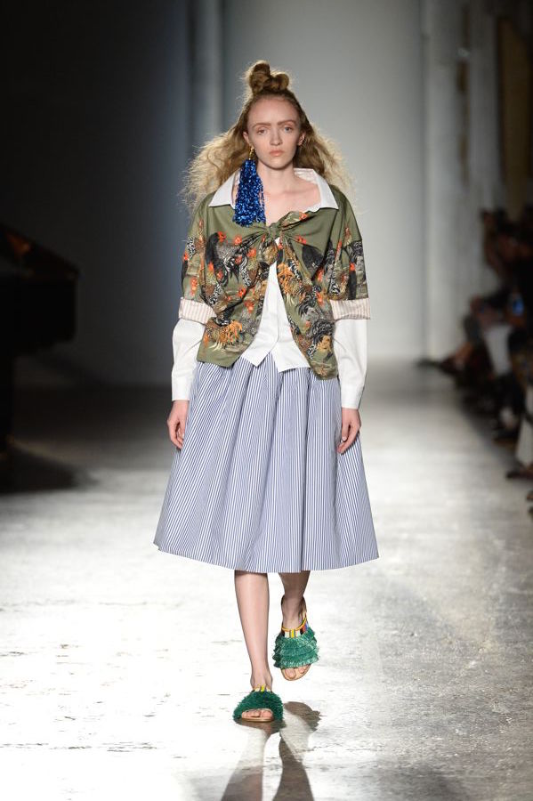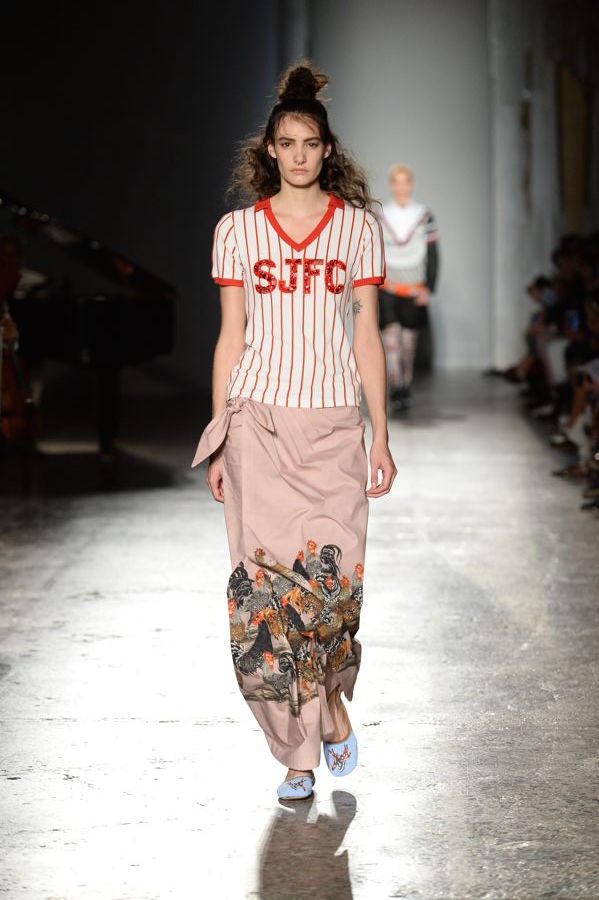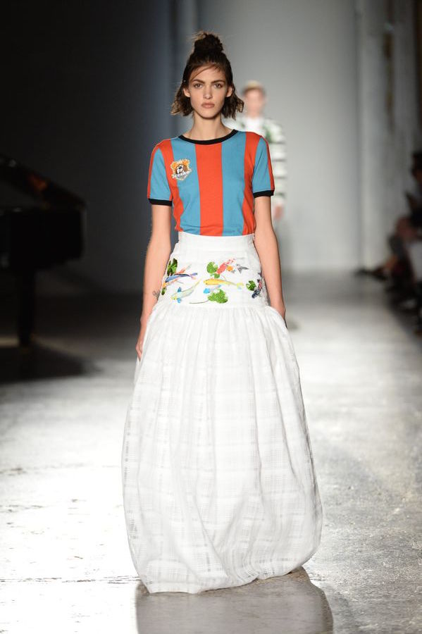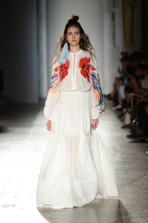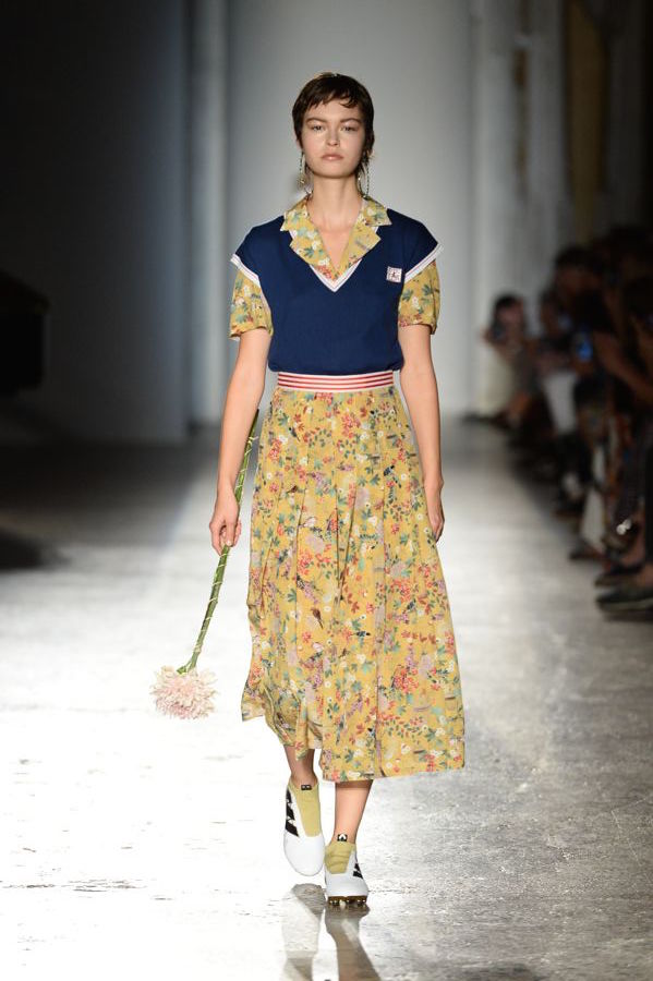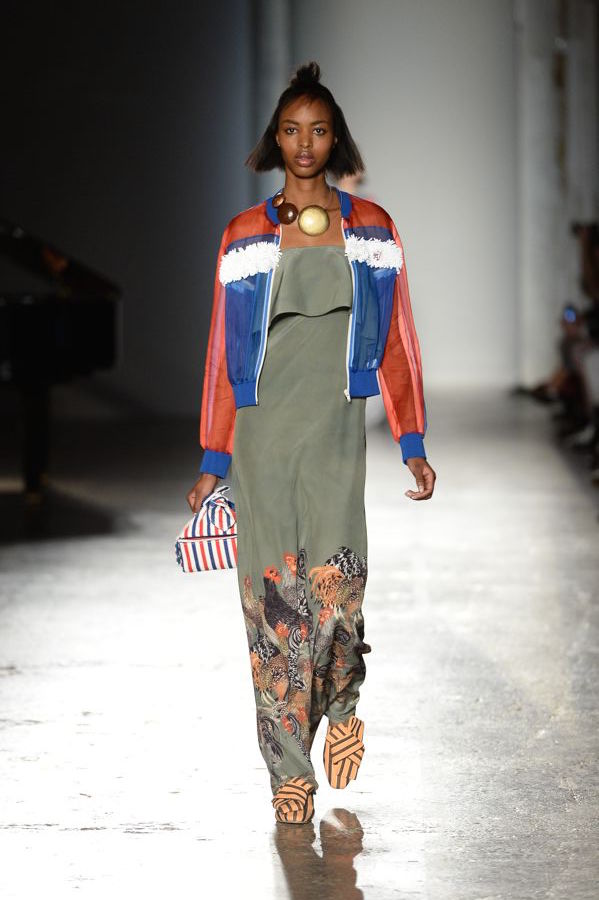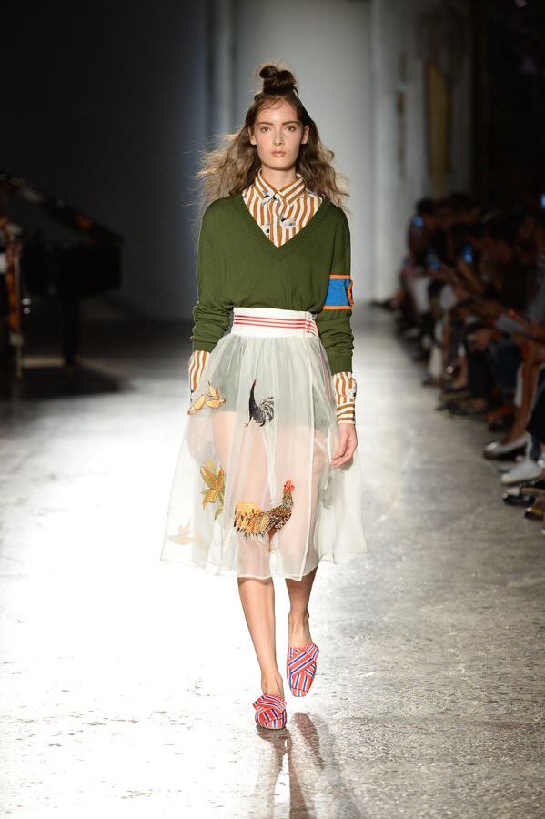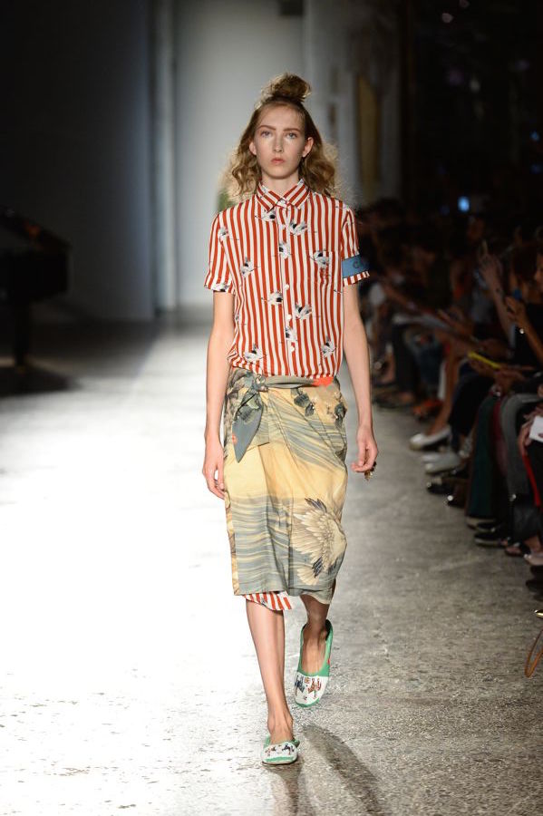 Lo chemisier gioca con il sarong, facendosi quasi da parte; camiciole da capitano sono infilate nelle gonne, polo soccer vintage sono abbinati a gonne dalla femminilità spiccata. Così shorts, tutine, abiti alla caviglia e al polpaccio dalle volumetrie fluide dribblano con le forme ad anfora e con giacche dal piglio deciso anni 80’. Fantasiose e giocose le stampe, fatte di tinte decise ma anche di tenui verde menta e rosa pallido; pitture di fiori, natura, e animaletti vari……; evocative quelle ispirate ai dipinti del pittore Haitiano Préfète Duffaut, celebre per il suo particolare stile naif; e poi pesci multicolori, eleganti cigni, aironi; stampe hawaiane. Spuntano dalle maniche a sbuffo di una candida camicia le teste allungate di due fieri galli che si fissano nelle orbite degli occhi, altri galletti emergono dalla gonna a tulle sormontata da camicetta e maglia dal piglio sportivo.