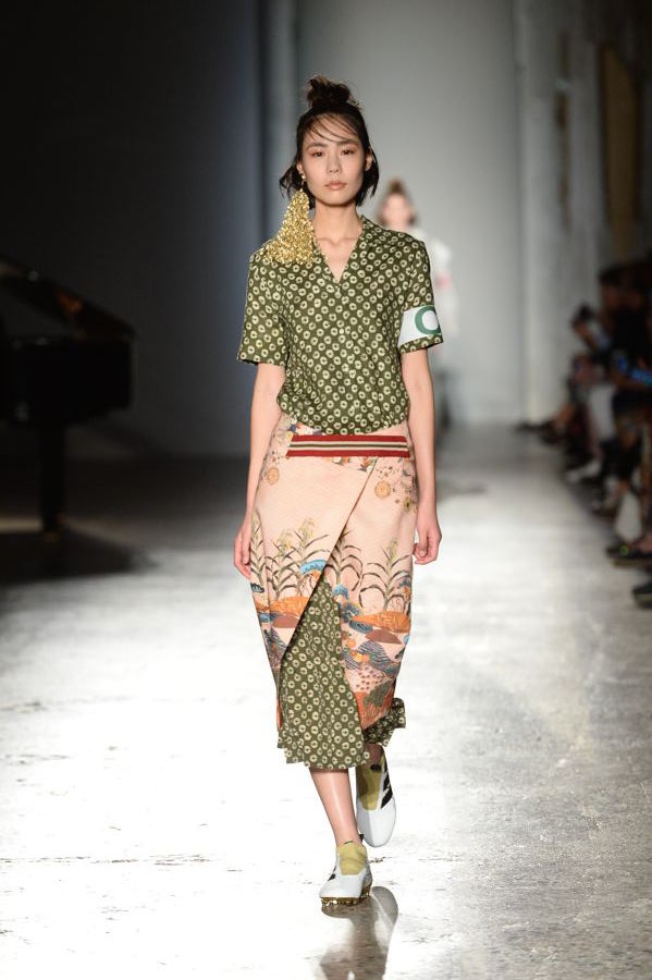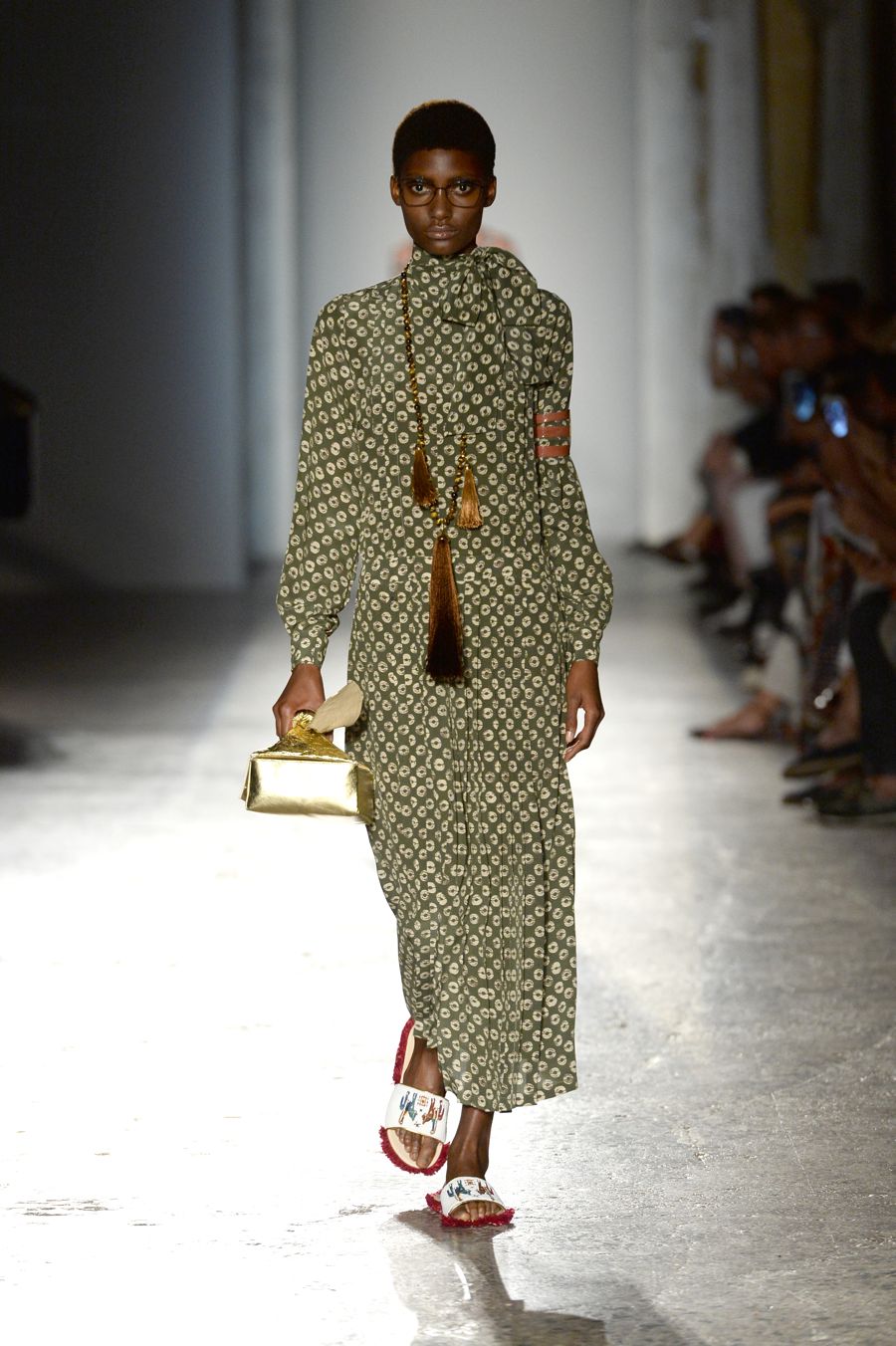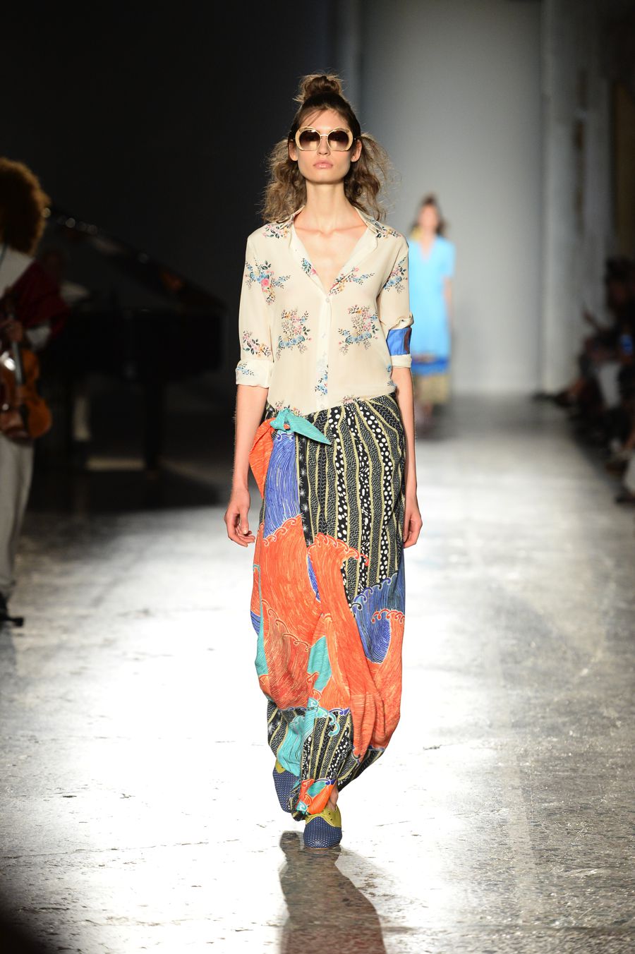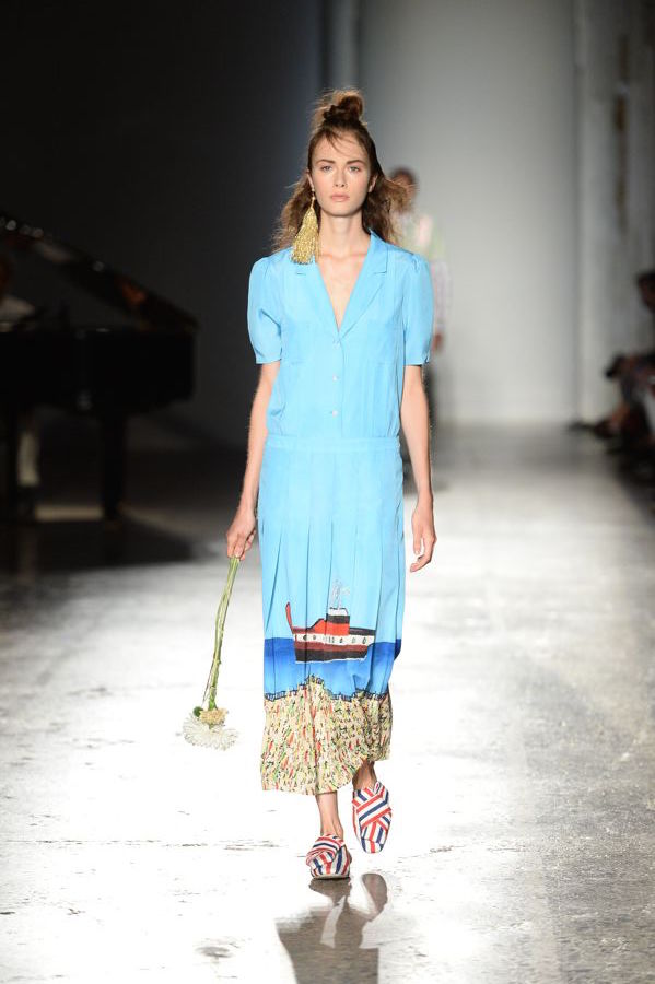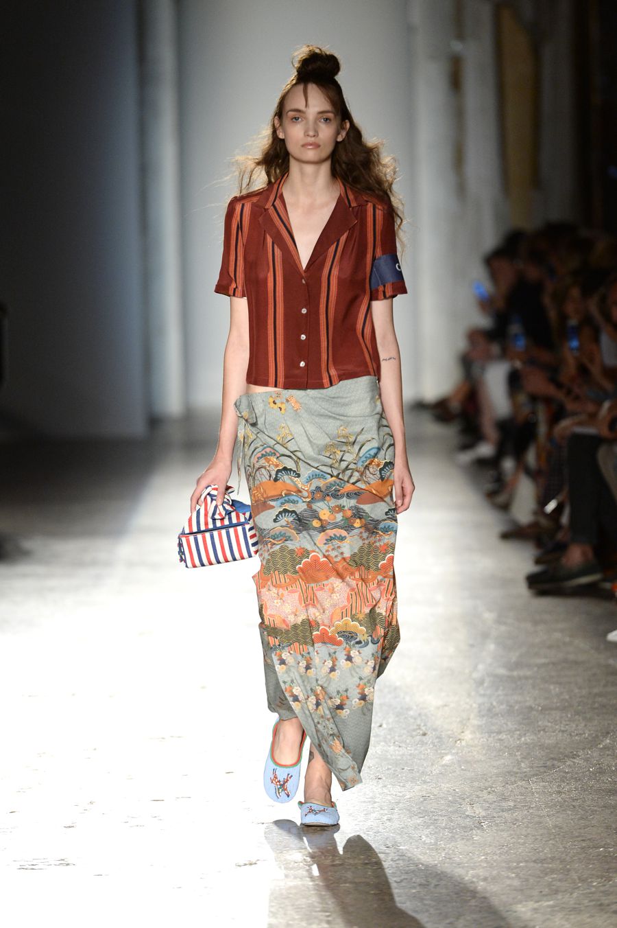 Lo chemisier gioca con il sarong, facendosi quasi da parte; camiciole da capitano sono infilate nelle gonne, polo soccer vintage sono abbinati a gonne dalla femminilità spiccata. Così shorts, tutine, abiti alla caviglia e al polpaccio dalle volumetrie fluide dribblano con le forme ad anfora e con giacche dal piglio deciso anni 80’. Fantasiose e giocose le stampe, fatte di tinte decise ma anche di tenui verde menta e rosa pallido; pitture di fiori, natura, e animaletti vari……; evocative quelle ispirate ai dipinti del pittore Haitiano Préfète Duffaut, celebre per il suo particolare stile naif; e poi pesci multicolori, eleganti cigni, aironi; stampe hawaiane. Spuntano dalle maniche a sbuffo di una candida camicia le teste allungate di due fieri galli che si fissano nelle orbite degli occhi, altri galletti emergono dalla gonna a tulle sormontata da camicetta e maglia dal piglio sportivo.
