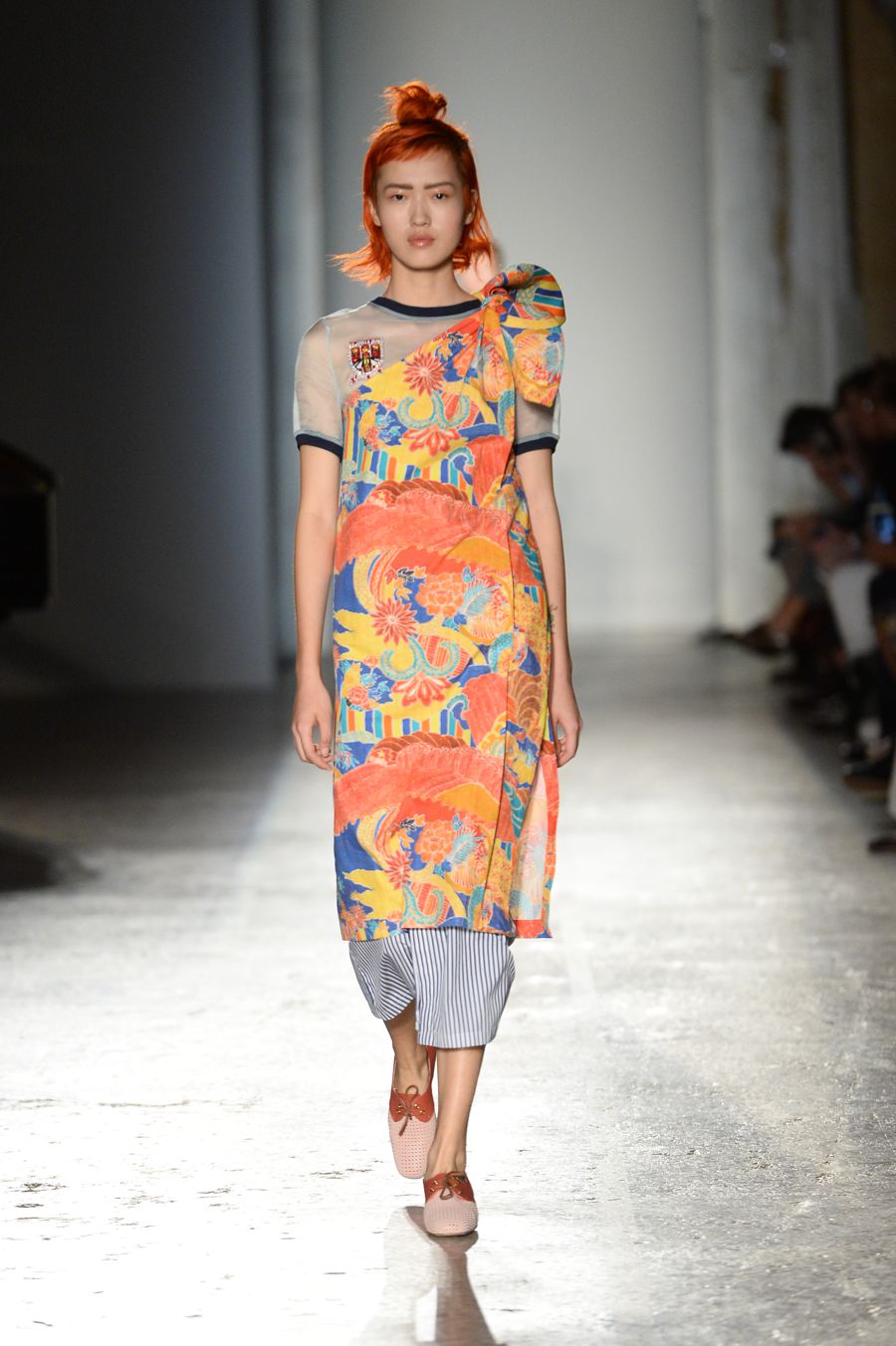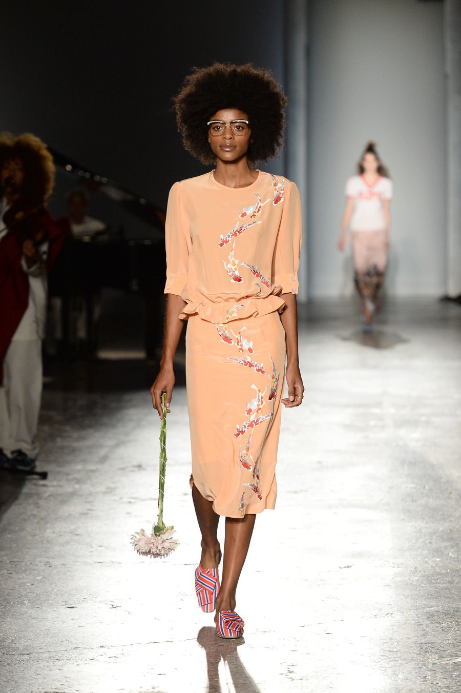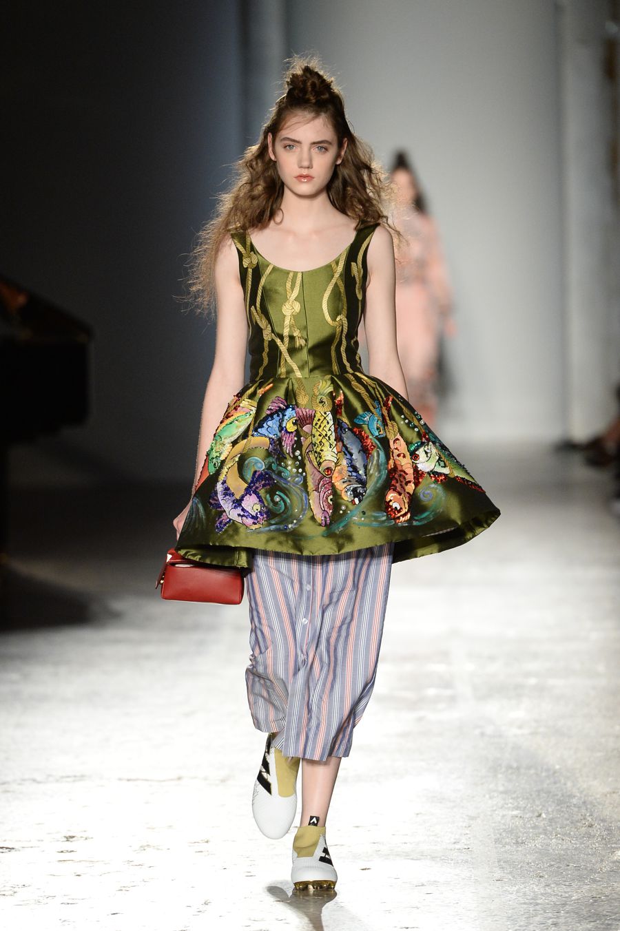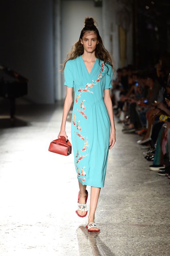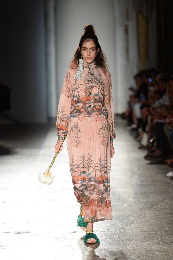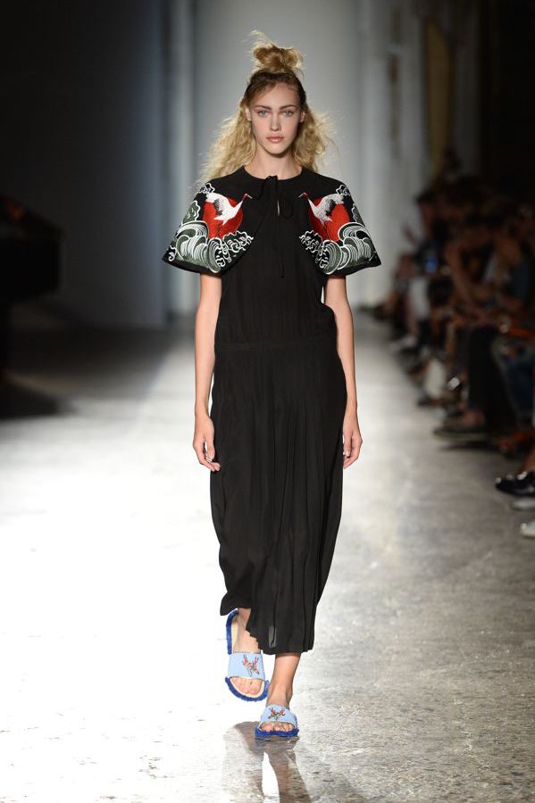 Lo chemisier gioca con il sarong, facendosi quasi da parte; camiciole da capitano sono infilate nelle gonne, polo soccer vintage sono abbinati a gonne dalla femminilità spiccata. Così shorts, tutine, abiti alla caviglia e al polpaccio dalle volumetrie fluide dribblano con le forme ad anfora e con giacche dal piglio deciso anni 80’. Fantasiose e giocose le stampe, fatte di tinte decise ma anche di tenui verde menta e rosa pallido; pitture di fiori, natura, e animaletti vari……; evocative quelle ispirate ai dipinti del pittore Haitiano Préfète Duffaut, celebre per il suo particolare stile naif; e poi pesci multicolori, eleganti cigni, aironi; stampe hawaiane. Spuntano dalle maniche a sbuffo di una candida camicia le teste allungate di due fieri galli che si fissano nelle orbite degli occhi, altri galletti emergono dalla gonna a tulle sormontata da camicetta e maglia dal piglio sportivo.