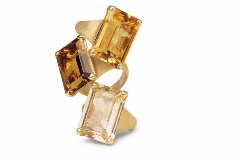 In queste nuove creazioni i colori sono enfatizzati mirabilmente dalla raffinatezza del taglio in ogni sfaccettatura. Incontriamo le gradazioni inebrianti del giallo quarzo con il citrino, il lemon fumè, il rutilato, lo champagne e la ricchezza dei diamanti brown. I profondi blu del topazio London e della tanzanite, e il delicato azzurro dell’acquamarina. Passando poi per la nobile tormalina verde fino ad arrivare a tutta la spregiudicatezza delle tonalità calde degli zaffiri rosa e della più violacea ametista.