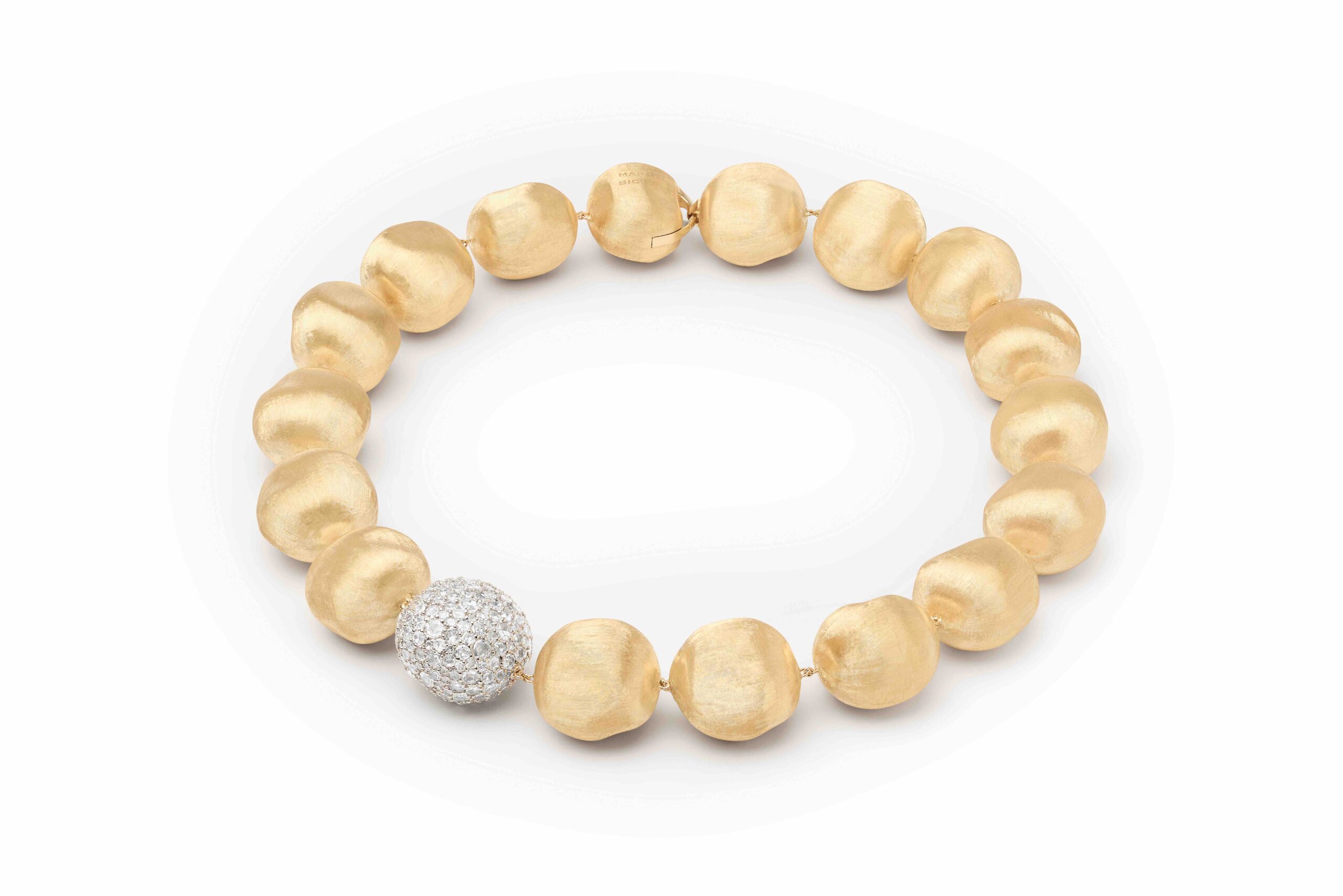 Cinque sono le collezioni reinterpretate. Fastosa e imponente, ammalia per l’opulenza ricercata la serie Africa Alta, che nella versione “diamantata” è come un’improvvisa vampata di caldo vento sahariano. Colpisce subito per il gioco esaltante di luce. Il bagliore accecante dei diamanti puri e perfetti nel loro prezioso ed esclusivo taglio rose‐cut si stempera nell’avvolgente abbraccio delle sfere in oro satinato che grazie all’antica tecnica del bulino millerighe, risultano molto setose al tatto.