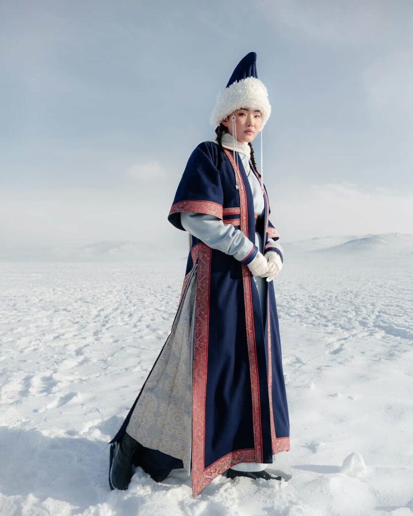 Ispirata agli abiti indossati già nell’Impero Mongolo tra il XIII e il XV secolo, la collezione reinterpreta il tradizionale deel, una tunica lunga indossata per proteggersi dai climi estremi, con spacchi laterali nella gonna, maniche lunghe, colletto alto e una chiusura sovrapposta sul davanti fermata da una fusciacca, simbolo di forza. Il deel varia nei materiali (cotone/seta in estate, lana/pelle in inverno) e colori, con tonalità vivaci per le donne e blu/marrone per gli uomini. La scelta dei materiali per le divise non è casuale: il cashmere mongolo è famoso per la sua leggerezza, calore e resistenza alle temperature più rigide. I dettagli tradizionali, come il colletto alto e le sovrapposizioni frontali, non sono solo estetici ma portano con sé simbolismi di protezione, calore e unità. “Ho scelto di concentrarmi sul periodo che va dal XIII al XV secolo -ha dichiarato il direttore creativo del marchio Goyol Cashmere responsabile dell’abbigliamento degli atleti mongoli per queste Olimpiadi-. Innanzitutto perché è l’epoca più conosciuta della storia del nostro Paese a livello mondiale. Inoltre, perché ritengo che gli abiti tradizionali di quel periodo incarnino nel modo più fedele la nostra identità nazionale e il nostro stile di vita nomade“, inoltre risultano comodi per andare a cavallo, tirare l’arco e percorrere lunghe distanze. Gli elementi grafici e le texture traggono ispirazione dalle ger le iconiche tende rotonde della Mongolia e dalla vita nomade. A realizzarle è stato il produttore di abbigliamento in cashmere di alta qualità Goyol Cashmere. Realtà aziendale nata da un’idea di Ariunaa Byambakhuu, la quale decise di lavorare tale pregiata fibra tessile direttamente a casa. In brevissimo tempo, Goyol Cashmere è diventato un punto di riferimento per la realizzazione capi in cashmere sostenibili e di lusso per i mercati locali e internazionali. Il termine “goyol” significa letteralmente “ornamento” o “decorazione”, ecco perché le divise ideate per i Giochi Olimpici di Milano Cortina 2026 sono ricche di dettagli, ad esempio il ricamo sul deel che racchiude i cerchi olimpici.