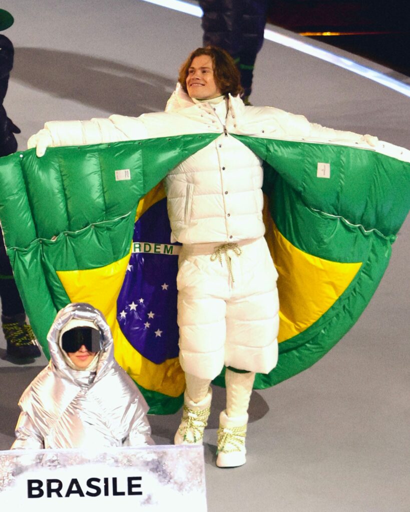 Altro nome del mondo della moda e più esattamente del luxury sportivo è quello di Moncler –al suo ritorno ai Giochi Olimpici Invernali dopo la prima volta dal 1968-che firma gli outfit della squadra brasiliana: direzione creativa di Remo Ruffini assieme allo stilista brasiliano Oskar Metsavaht. Voluminose mantelle bianche, verdi all’interno con ampio cappuccio per i porta-bandiere sono ispirate a quelle preparate per gli alpinisti italiani Achille Compagnoni e Lino Lacedelli durante la storica prima salita del K2. All’interno della giacca la bandiera brasiliana è applicata con cuciture a intarsio, La bandiera colma di significati, è verde con un rombo color oro; al centro del rombo un cerchio blu, una sfera, che contiene 27 stelle che rappresentano ciascuna uno dei 26 Stati della Repubblica Federale e il Distretto Federale; una banda bianca che attraversa la sfera reca inscritto il motto nazionale del Paese, in portoghese Ordem e Progresso, «Ordine e progresso». Le costellazioni che figurano nella bandiera corrispondono al cielo sopra Rio de Janeiro il 15 novembre 1889 giorno della Dichiarazione della Repubblica. Gli altri componenti della squadra sfilano in blu e verde. I look blu sono composti dalle iconiche giacche Moncler, abbinate a shorts per gli uomini e a gonne per le donne. Il look si completa con gli stivali Moncler Altive reinterpretati in esclusive varianti di colore nei toni del bianco e del blu.