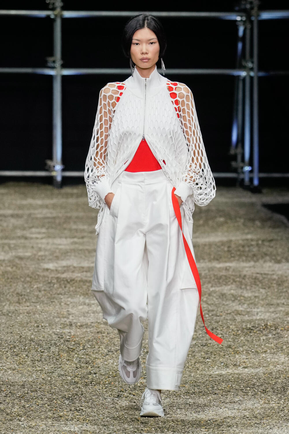 La linea gonfia a palloncino, nei pantaloni lunghi o bermuda, nelle gonne e abitini, nelle maniche, regala una silhouette attuale che non perde eleganza anche se l’immagine risultante è di capi ‘cargo’, sportivi e comodissimi. Nei capi scivolati, aderenti, è il tessuto leggero a maglia a trasmettere confort, mentre le linee morbide e abbondanti dei trench trasmettono un look rilassato e sportivo. Il passaggio di caschi da operai edili in mano alle modelle trasmette l’idea della rigenerazione, della ricostruzione a partire da ciò che era stato scartato.