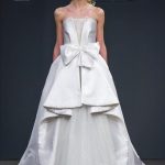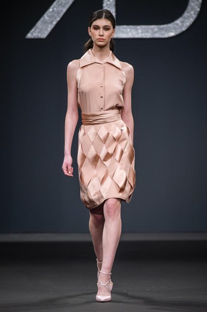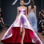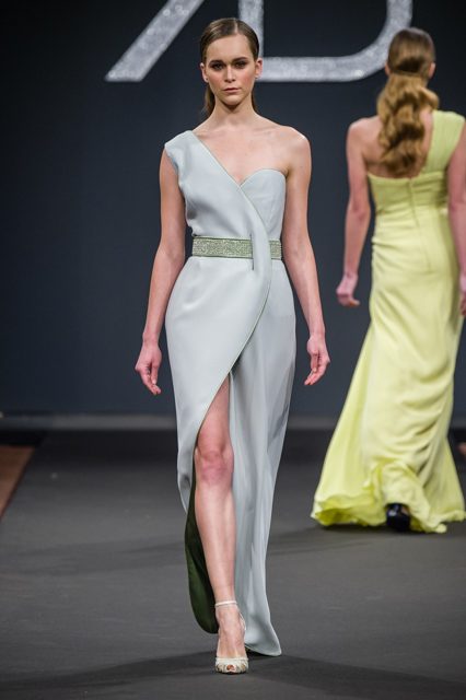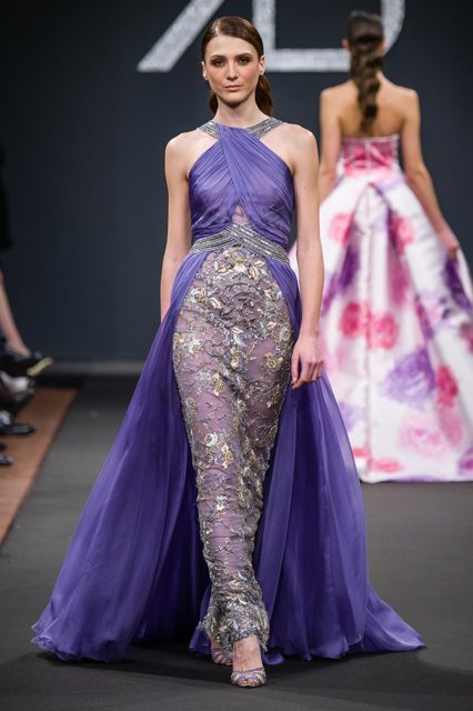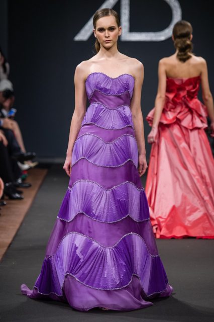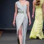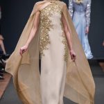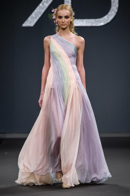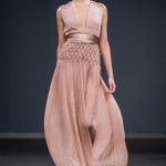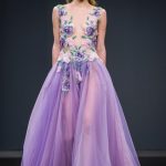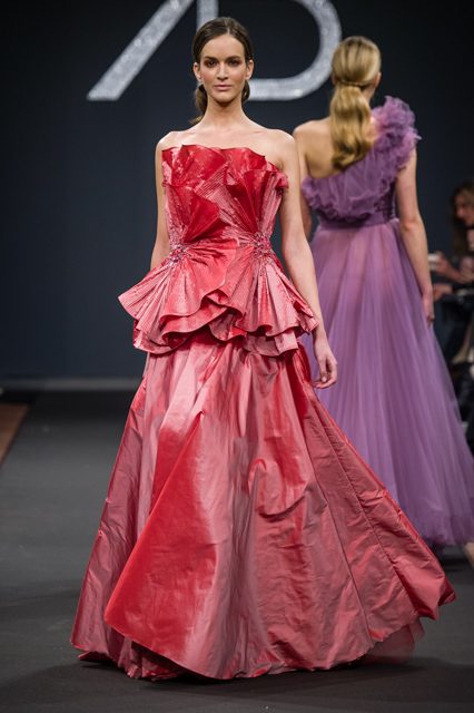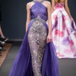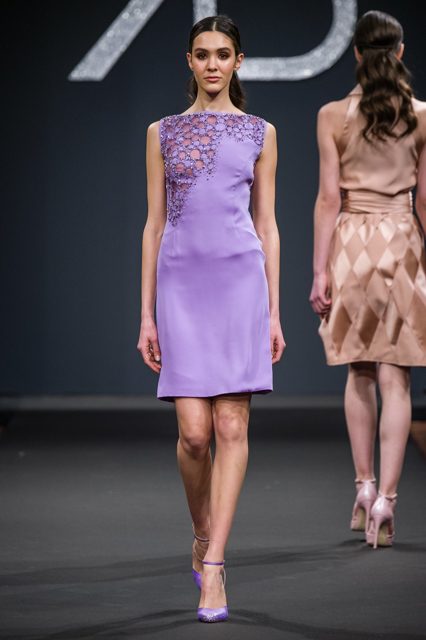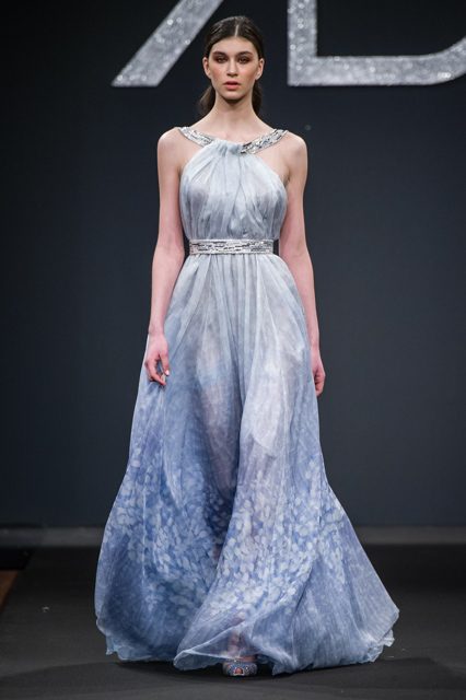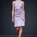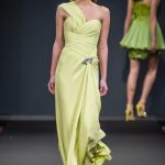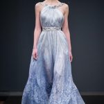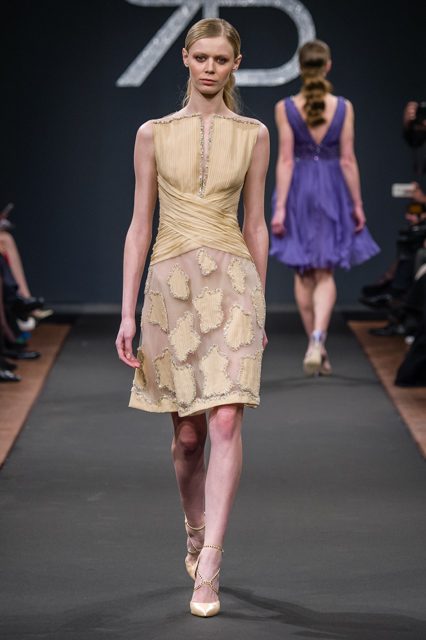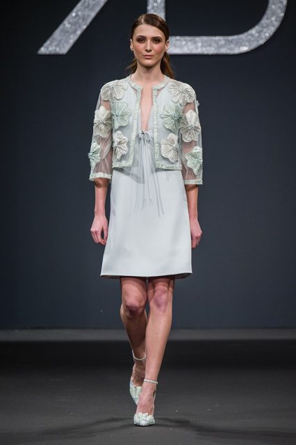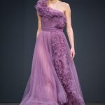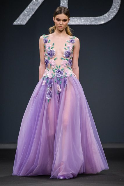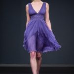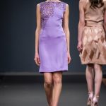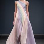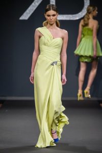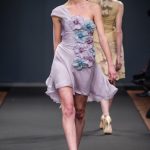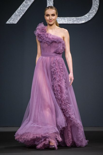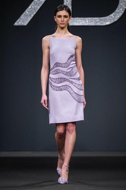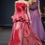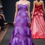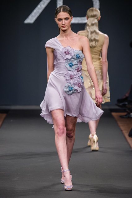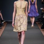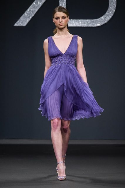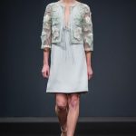 Nell’insieme la collezione non ha convinto, talvolta, in alcune uscite, lascia la sensazione di cose già viste, anzi di cose di sapore vintage, come l’abito dalla gonna in tulle e inserti, effetto maculato, o quello lungo color melanzana, a balze ondeggianti; o le applicazioni di grandi fiori sulla giacchina acquamarina e sull’abito monospalla color glicine. Belli invece l’abito rosa dalla gonna plissettata, la baschina lavorata con applicazioni che fanno effetto nido d’ape. Tessuto leggerissimo celeste, stampato a fiori più chiari, per il bell’abito dalla scollatura all’americana fermata, come la cintura, da un nastro con incrostazioni luminose. Di effetto e fortemente appariscente, l’abito dai grandi fiori stampati, foderato in rosso, dall’ampio strascico; ammiratissimo l’abito in tulle glicine col corpetto dalla profonda scollatura, impreziosito da rose ricamate in tutte le nuance; ancora tulle per l’abito di strati di viole lungo malva pallido con spirale di ruche nel corpino, nella gonna e nell’orlo. Infine, chiude la collezione l’abito da sposa in candido mikado e pizzo chantilly, equilibrato nella costruzione, un “edificio” assolutamente simmetrico; classico, ma di effetto.