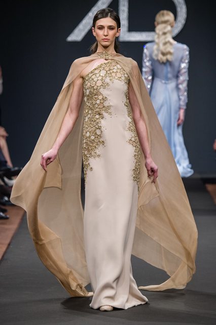 Plissè volute e drappeggi, tulle e voile; linee scivolate e a sirena; punto vita sottolineata; colori pastello, cannutiglie e cristalli: in sintesi una collezione meno appariscente, più sobria delle abituali del Maestro, e con esiti diversi secondo gli abiti.
