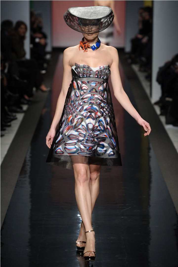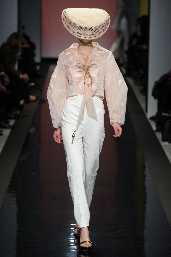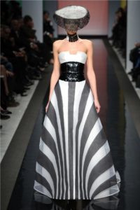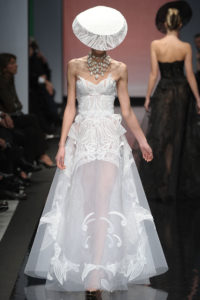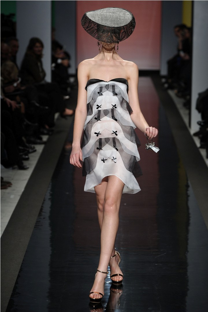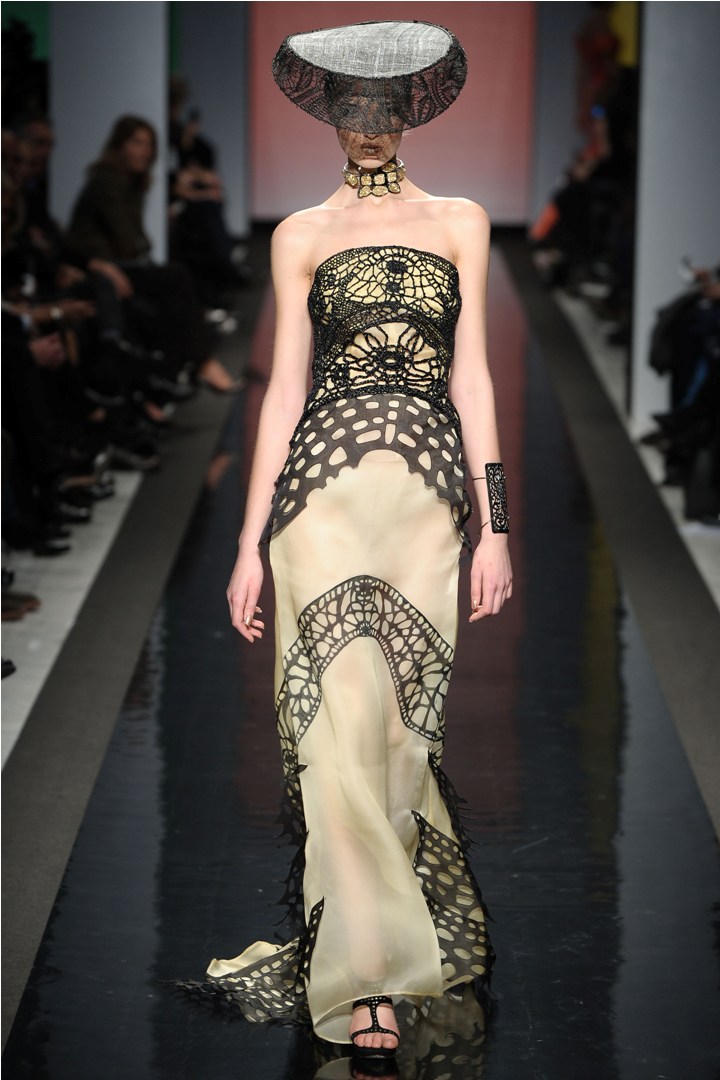 La collezione punta su souplesse e trasparenze. Bianco, nero e avorio offrono un interessante contrappunto cromatico dialogando con colori più caldi come il giallo cadmio, l’arancio e il corallo. Proprio il giallo, il bianco e l’arancio definiscono abiti lunghi dalle spalline scivolate caratterizzati da corpetti e baschine, che sembrano rielaborare, con gusto assolutamente contemporaneo, le suggestioni del costume tardo-ottocentesco e della Belle Époque. Le creazioni si abbinano a cappelli che rievocano il fascino della veletta, caratterizzati da forme avveniristiche. Il nero è maestro di stile negli abiti bustier che giocano con differenti lunghezze, nell’alternanza a righe con il colore bianco, nelle “ragnatele” trompe l’oeil e in black shadows che ricoprono forme fluide, mini abiti o gonne aerodinamiche. Fra le sfumature del bronzo, del rame e dell’ematite ombre anaglifiche dipinte spuntano al di sotto dell’ombra reale proiettata dalle stoffe intagliate. Pizzi e ricami descrivono chiaroscuri giganteschi, si arricchiscono di effetti cangianti. I materiali che vanno dal tulle all’organza, dallo chiffon al mikado, sono impreziositi da arabeschi che creano sensazioni fra il vuoto e il pieno, veri e propri scorci prospettici. Sfilano tessuti in filigrana con paillettes irisées che determinano effetti luminescenti, ricami con cristalli ton sur ton mentre il velo si ricopre di “farfalle meccaniche”.