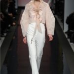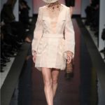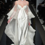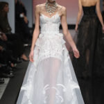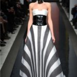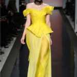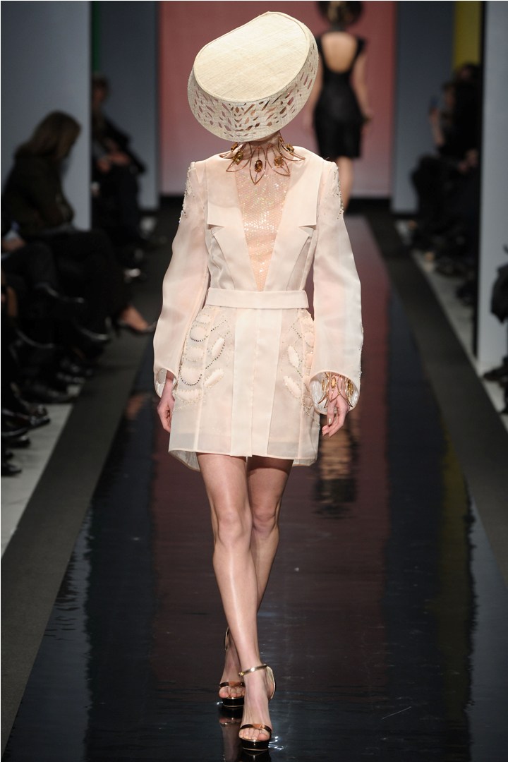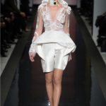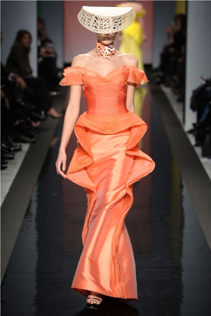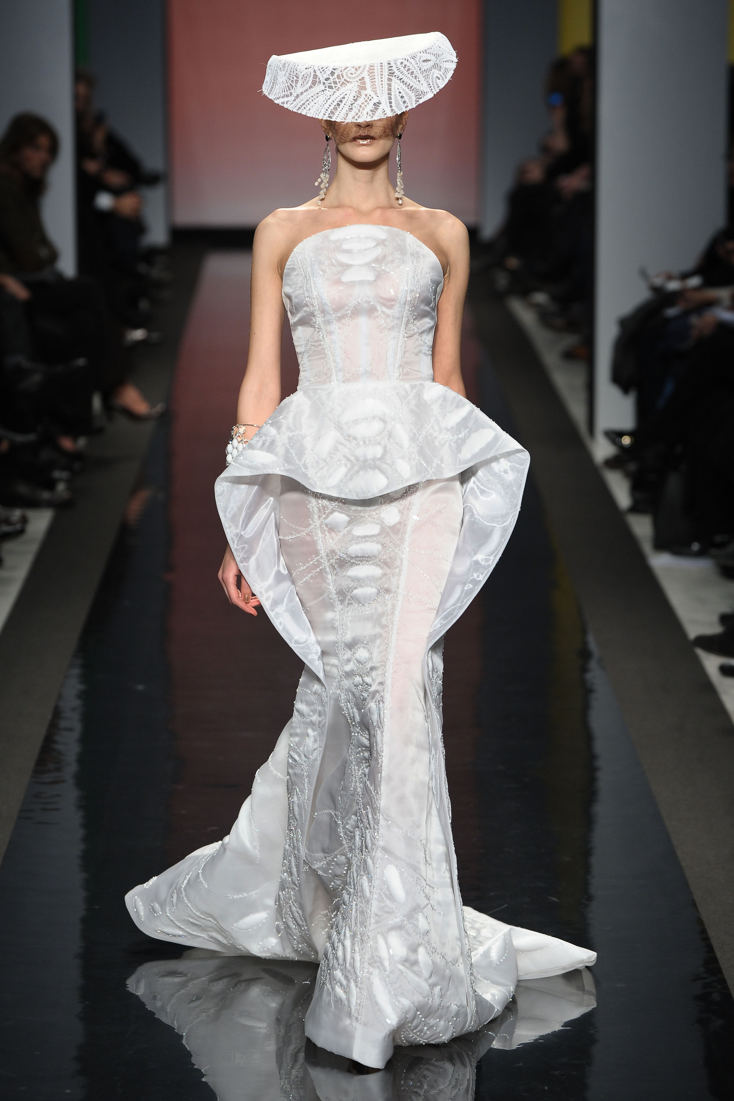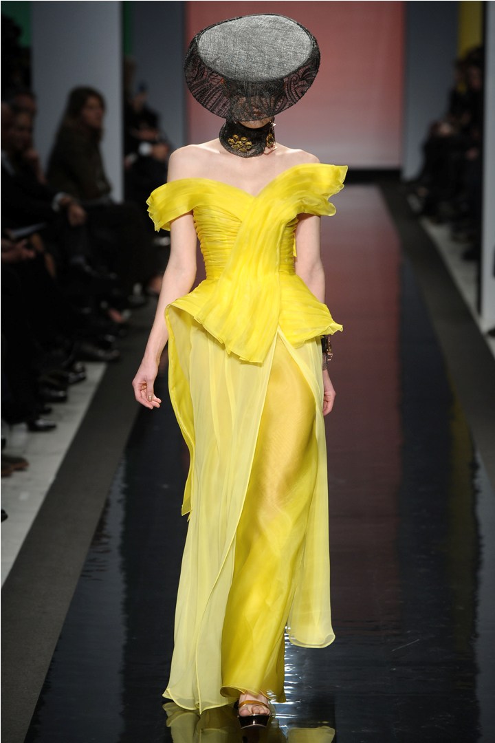 La collezione punta su souplesse e trasparenze. Bianco, nero e avorio offrono un interessante contrappunto cromatico dialogando con colori più caldi come il giallo cadmio, l’arancio e il corallo. Proprio il giallo, il bianco e l’arancio definiscono abiti lunghi dalle spalline scivolate caratterizzati da corpetti e baschine, che sembrano rielaborare, con gusto assolutamente contemporaneo, le suggestioni del costume tardo-ottocentesco e della Belle Époque. Le creazioni si abbinano a cappelli che rievocano il fascino della veletta, caratterizzati da forme avveniristiche. Il nero è maestro di stile negli abiti bustier che giocano con differenti lunghezze, nell’alternanza a righe con il colore bianco, nelle “ragnatele” trompe l’oeil e in black shadows che ricoprono forme fluide, mini abiti o gonne aerodinamiche. Fra le sfumature del bronzo, del rame e dell’ematite ombre anaglifiche dipinte spuntano al di sotto dell’ombra reale proiettata dalle stoffe intagliate. Pizzi e ricami descrivono chiaroscuri giganteschi, si arricchiscono di effetti cangianti. I materiali che vanno dal tulle all’organza, dallo chiffon al mikado, sono impreziositi da arabeschi che creano sensazioni fra il vuoto e il pieno, veri e propri scorci prospettici. Sfilano tessuti in filigrana con paillettes irisées che determinano effetti luminescenti, ricami con cristalli ton sur ton mentre il velo si ricopre di “farfalle meccaniche”.