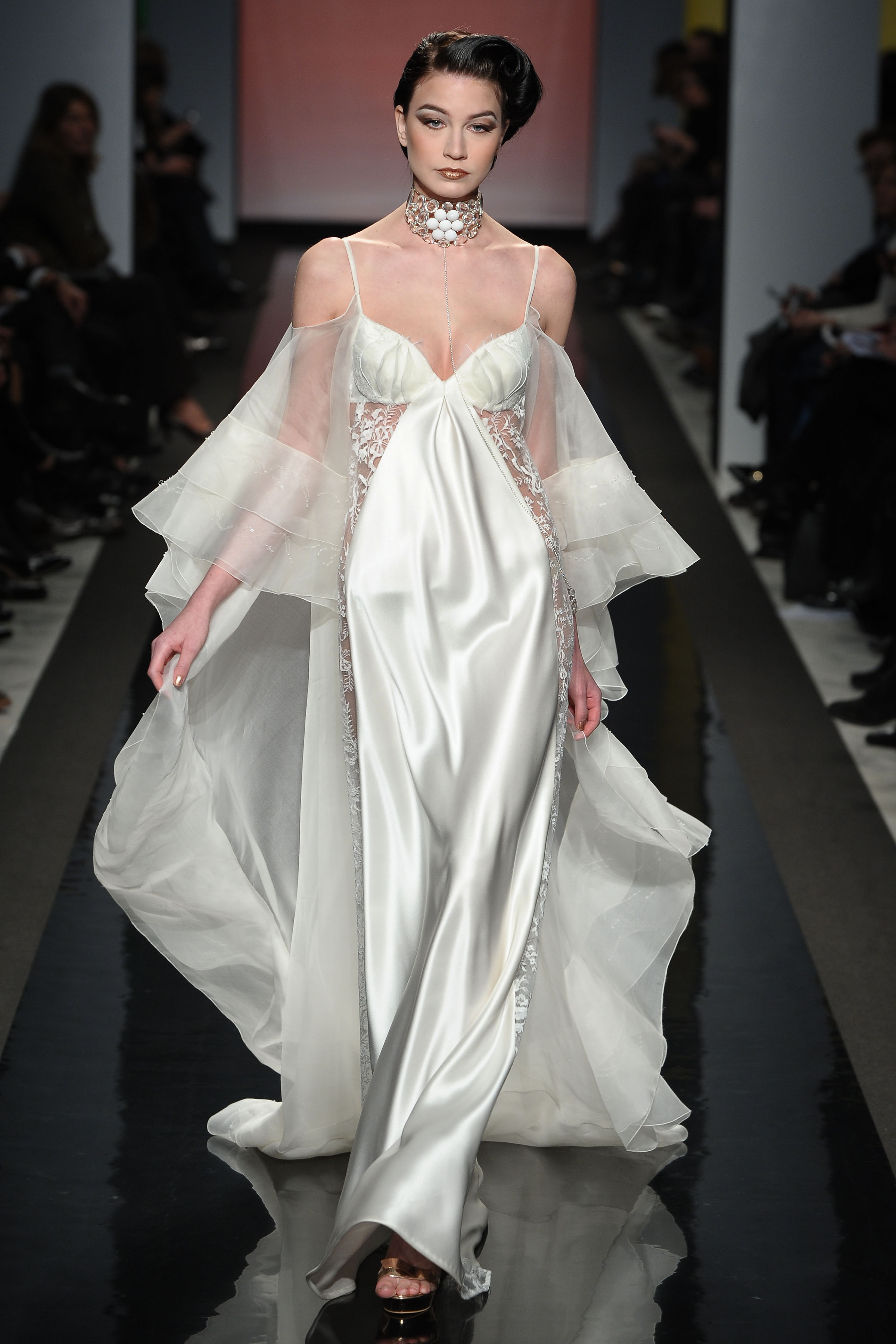 Accanto ad abiti da gran sera, da cocktail, jumpsuits e completi pantalone, all’abito da sposa, hanno conquistato la passerella camicie preziose, vestaglie in organza e satin con volants, ricami realizzati in rafia e cristalli per la prima notte di nozze. La presentazione della primavera/estate di Gattinoni ha incluso, assieme alla lingerie couture ideata da Mariotto, un bikini gioiello interamente realizzato con pietre dure da Gianni de Benedittis, designer del brand futuroRemoto, creatore degli accessori della collezione, veri e propri pezzi di arte orafa ispirati ad un immaginario favolistico popolato di re, regine e principesse, scarpette di cristallo, troni e corone.