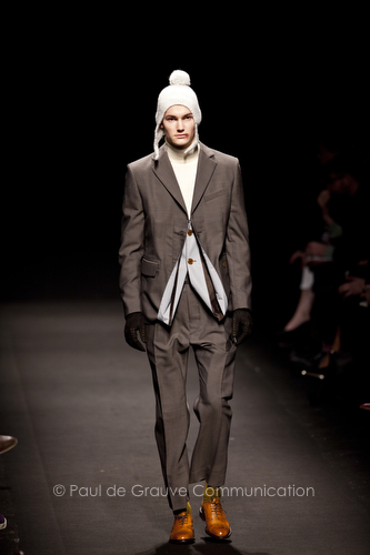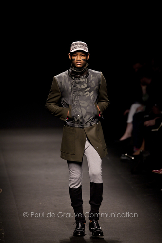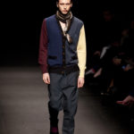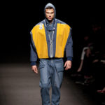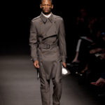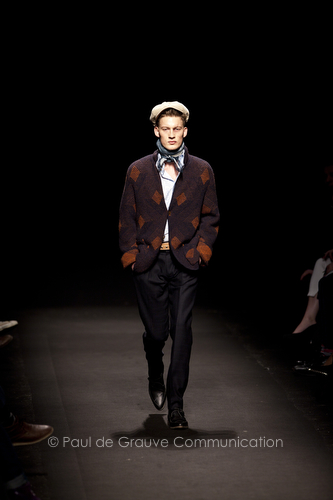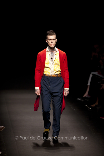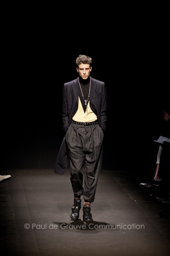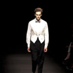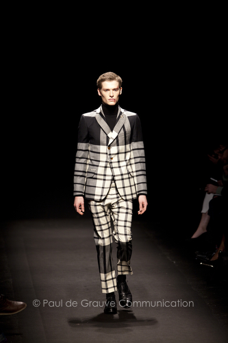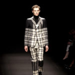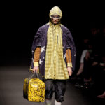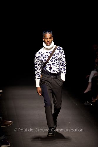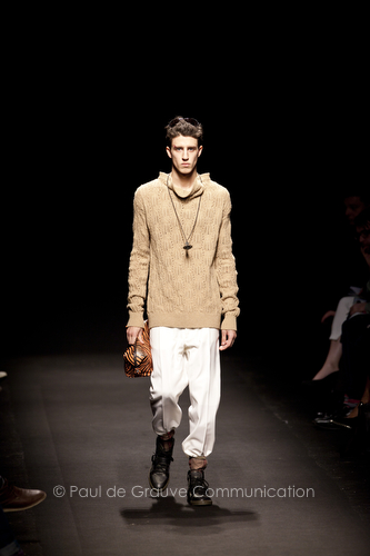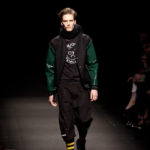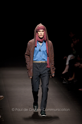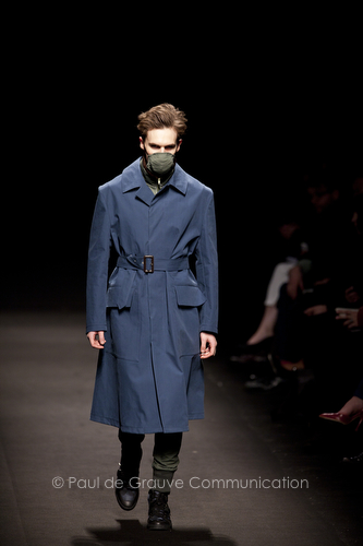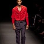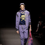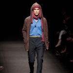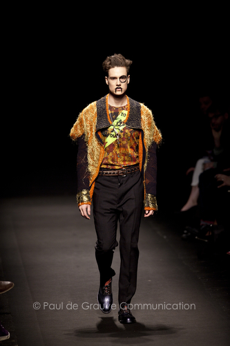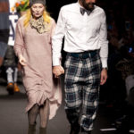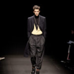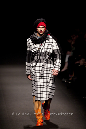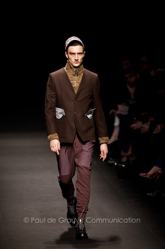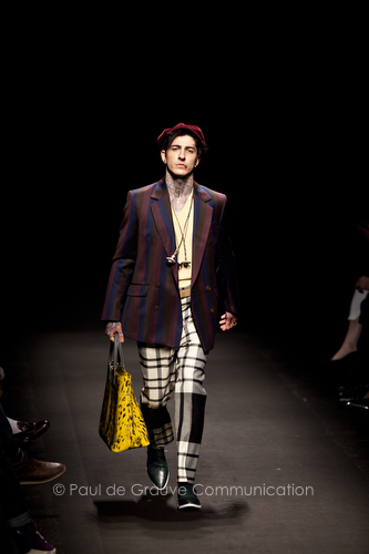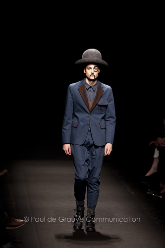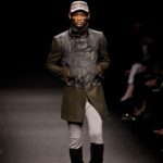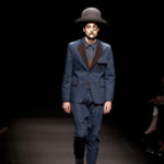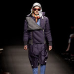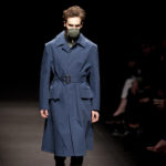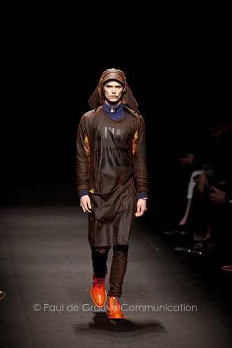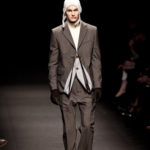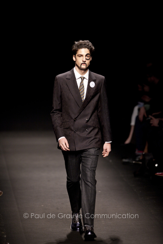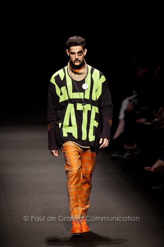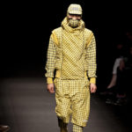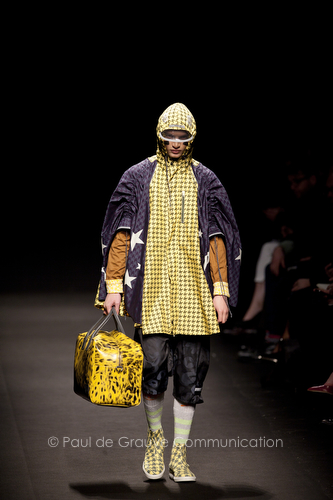 Come lo fa? In due modi. Il primo utilizzando il volto dei ragazzi che sfilano. I suoi outft sono di per sé ironici e non basta stampare un teschio o fare indossare una mascherina con lo stesso tessuto pied-de-poule per denunciare il pericolo di morte del pianeta. Molto più efficace, contundente, agire sul viso dei modelli con un make up che ricordi la consuetudine di molti popoli guerrieri -a noi forse vengono immediatamente alla memoria i pellirossa d’America- di tracciare sul volto i segnali colorati della guerra. I nostri guerrieri portano segni neri; con una traccia di eyeliner sll’orbita oculare o ai lati della bocca, si trasformano in combattenti dal sorriso duro e volto arrabbiato, segnato da cicatrici e portano i capelli ispidi tipici d luoghi desertici o almeno con scarsità di acqua.