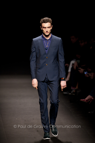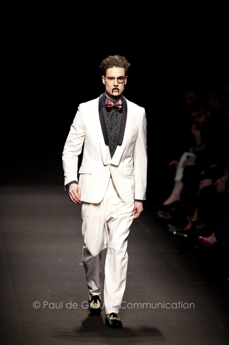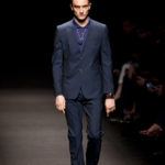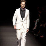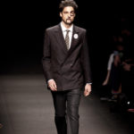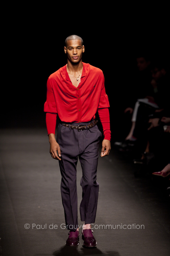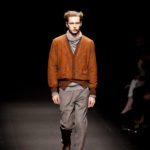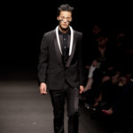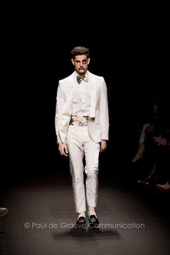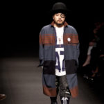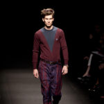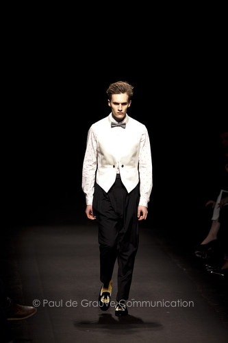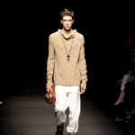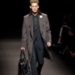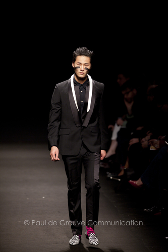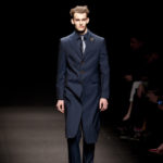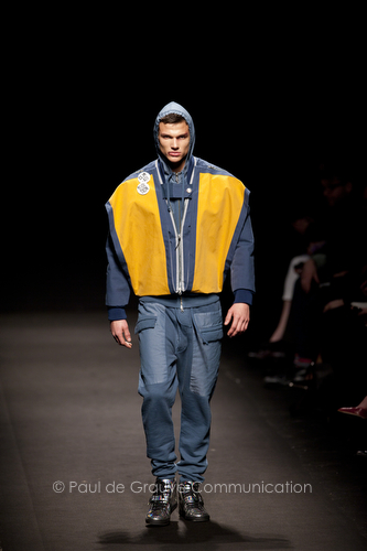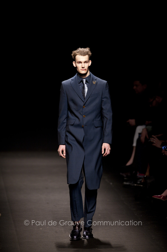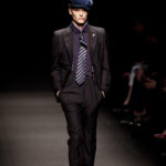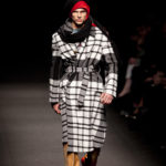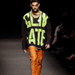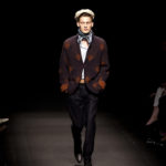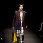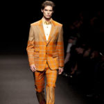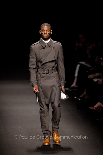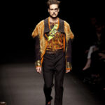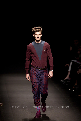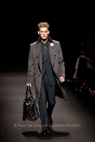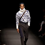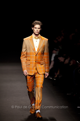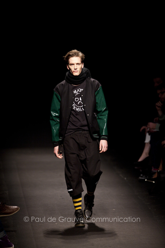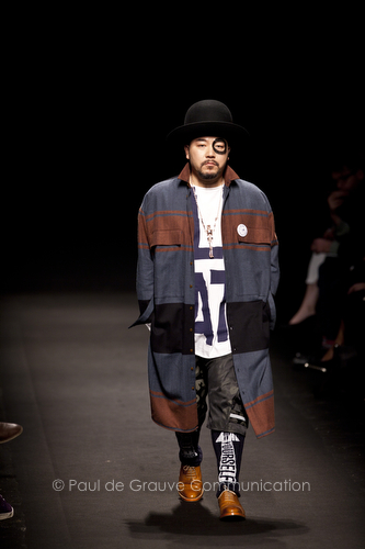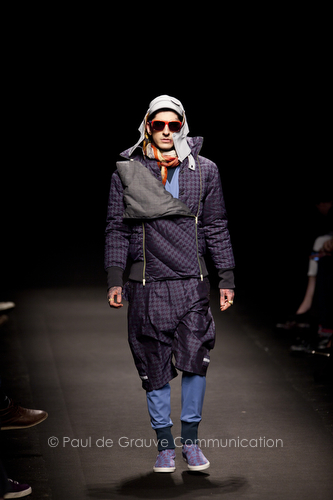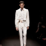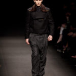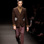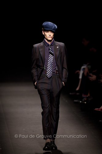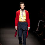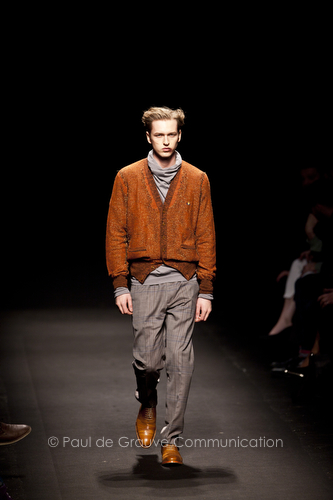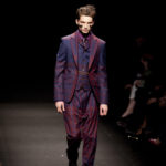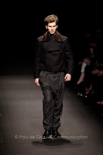 Come lo fa? In due modi. Il primo utilizzando il volto dei ragazzi che sfilano. I suoi outft sono di per sé ironici e non basta stampare un teschio o fare indossare una mascherina con lo stesso tessuto pied-de-poule per denunciare il pericolo di morte del pianeta. Molto più efficace, contundente, agire sul viso dei modelli con un make up che ricordi la consuetudine di molti popoli guerrieri -a noi forse vengono immediatamente alla memoria i pellirossa d’America- di tracciare sul volto i segnali colorati della guerra. I nostri guerrieri portano segni neri; con una traccia di eyeliner sll’orbita oculare o ai lati della bocca, si trasformano in combattenti dal sorriso duro e volto arrabbiato, segnato da cicatrici e portano i capelli ispidi tipici d luoghi desertici o almeno con scarsità di acqua.