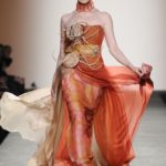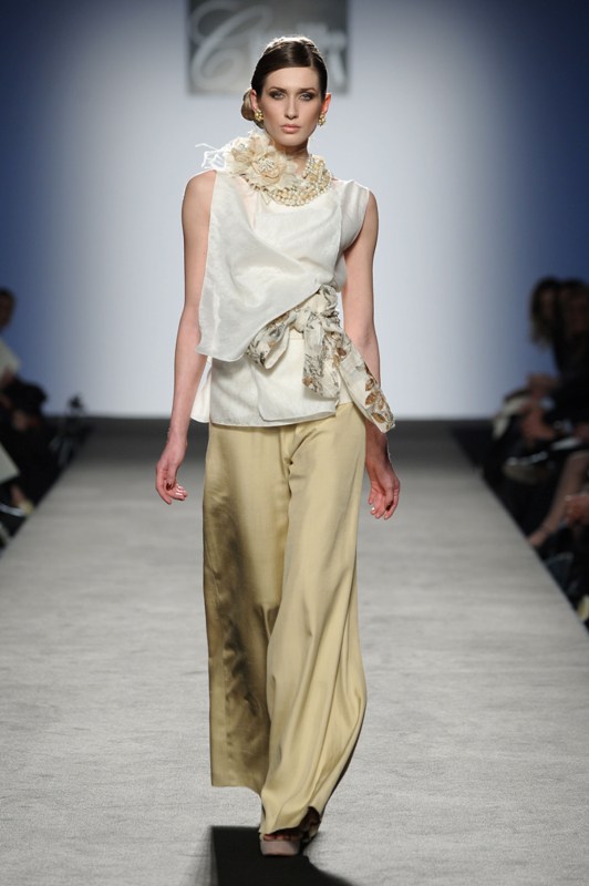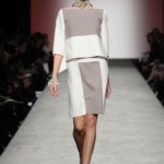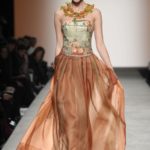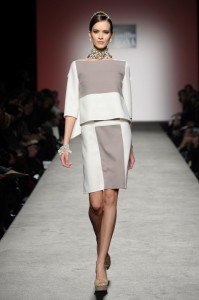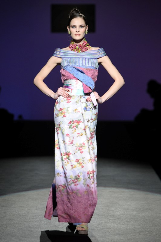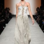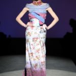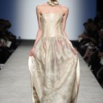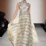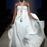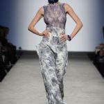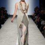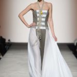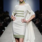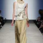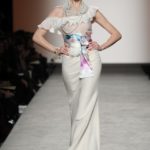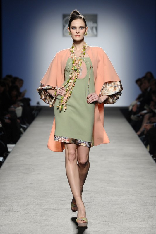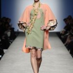 Sfilano corpini e gonne “illustrati”, il gioco fra stampe e ricami soprattutto floreali, con-fonde la natura dei differenti dettagli. Camillo Bona ci ha raccontato in proposito: “C’è un denominatore comune nelle mie creazione. Mi piace l’abito che sembra semplice in apparenza ma che nasconde una costruzione complessa, un gioco. Mi piace che gli elementi di complessità non appaiano al primo colpo d’occhio preferisco che l’abito si riveli e venga scoperto solo mano a mano”. Come già accennato è centrale nella collezione l’idea della trasformazione, molti capi sono pensati “in divenire” e con diverse possibilità d’uso. Mutano per corrispondere alla personalità specifica della donna che li indosserà. Si passa da giacchini adattabili nelle lunghezze che all’occorrenza divengono spolverini ad apparenti decorazioni con riccioli scultorei che possono essere staccati dallo scollo dell’abito tubino e riutilizzati indipendentemente magari come stola, capi che si possono trasformare insomma, che rivelano particolari in grado di modificare la silhouette e di fare di un singolo outfit differenti proposte di stile. Anche fra gli accessori, caratterizzati da perle e pietre, ci sono collane con zip che possono essere indossate in maniera duplice: tenute unite o separate.