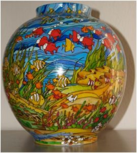 La tecnica che caratterizza l’attività artistica di Emanuela Volta si ispira a quella del “terzo fuoco”, per cui vengono utilizzati speciali smalti francesi a base d’acqua applicati su oggetti bianchi in porcellana e ceramica già smaltati, in seguito cotti a basse temperature (150°). Un metodo speciale, dunque, con il quale si ottengono pezzi esclusivi e inimitabili, che possono anche essere utilizzati quotidianamente: li si può persino infilare nella lavastoviglie!