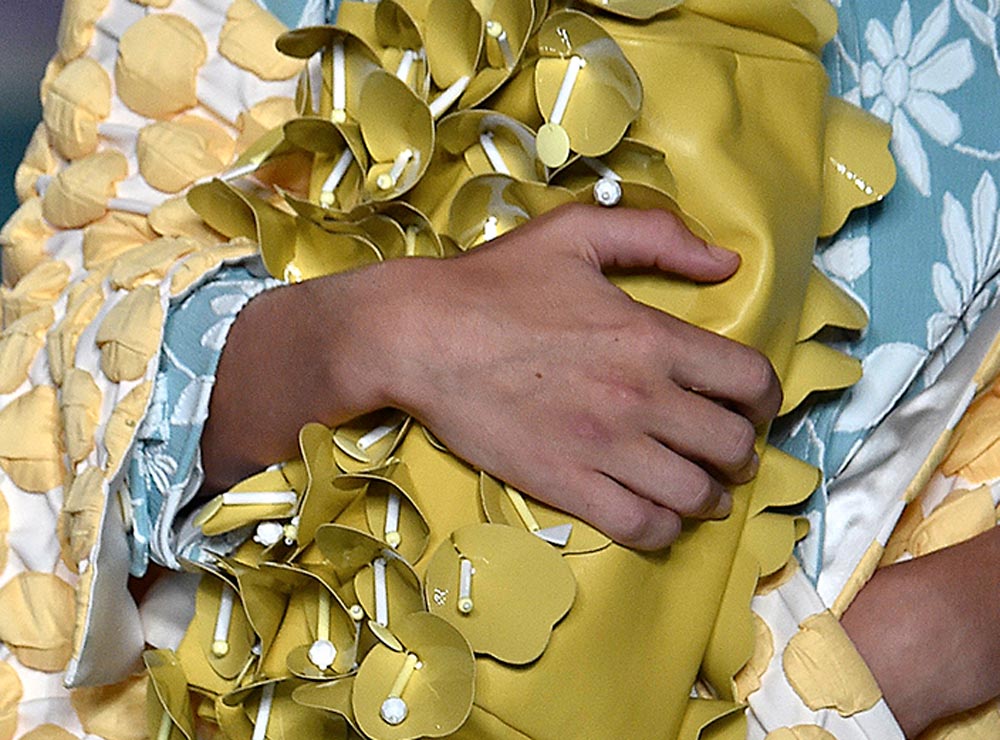 Queste cascate floreali di ibiscus, orchidee e tiarè sono adagiate con gusto e armonia senza risultare troppo abbondanti o sovrastrutturate. Il poliestere della base è leggero e poroso molto avangard; le decorazioni in pelle lucida, cotone e plastica siliconata si distinguono per l’accuratezza del taglio; mentre punti luce di paillettes, strass e perline illuminano petali e corolle tridimensionali che svolazzano qua là rendendo il movimento molto fluido e leggero. L’indosso è strutturato e tendenzialmente skinny, si appoggia ai lineamenti del viso senza trascurare però la portabilità. C’è anche la variante a fascia fermacapelli.