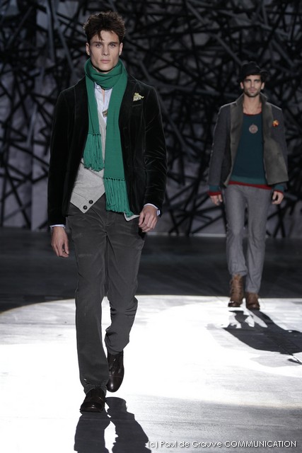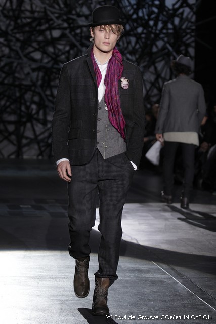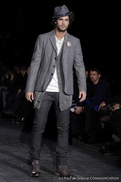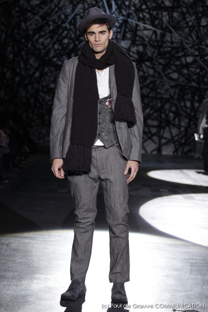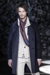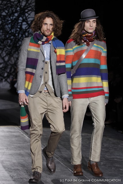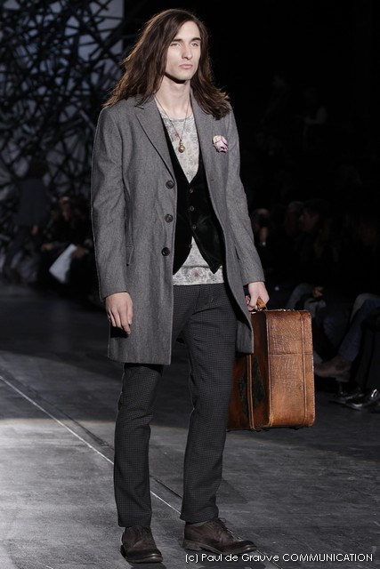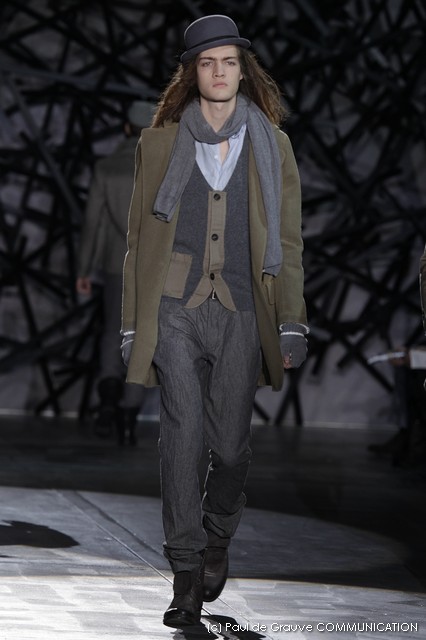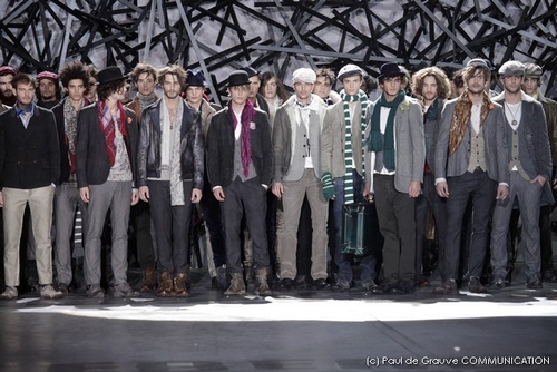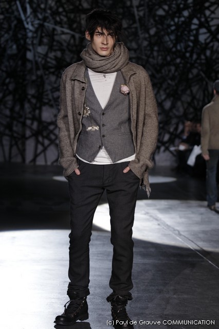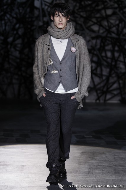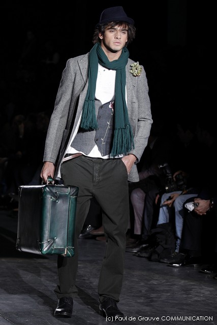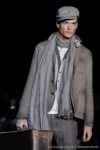 La collezione è ricca e comunque si fa ammirare. Molti i contrasti. Dall’abbigliamento trasandato a quello curatissimo quasi da dandy: pantaloni chiari, pullover grigio celeste, giacca sfoderata chiara, lunga sciarpa attorno al collo di un celeste più intenso, elegantissima borsa da viaggio per trasportare un plaid, cappello. L’elemento più ripetuto? Il gilet, portato su una T-shirt fantasia, o bianca, vezzosamente ricamato con un fiore.