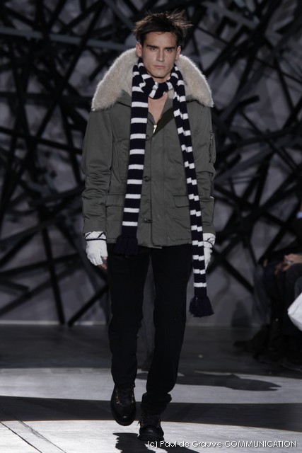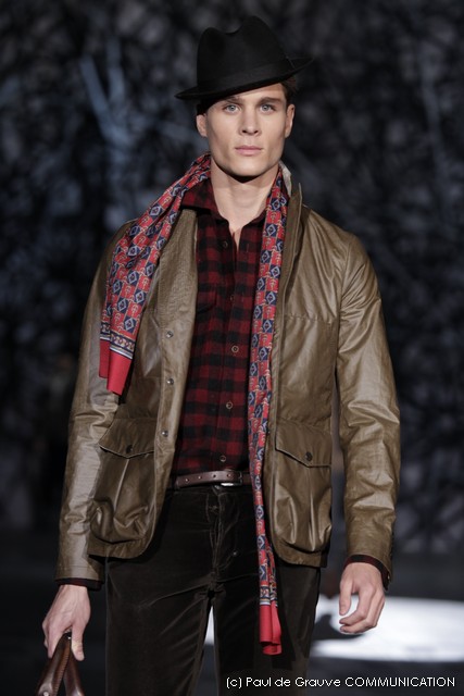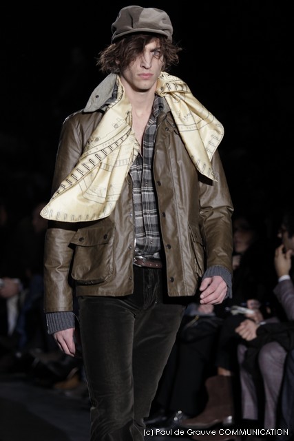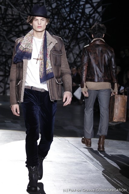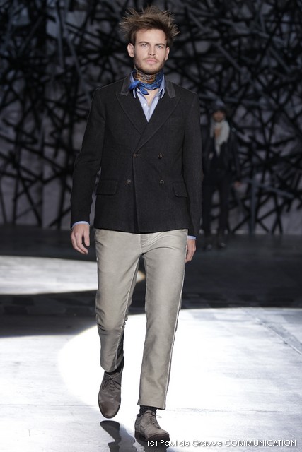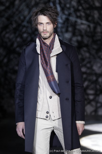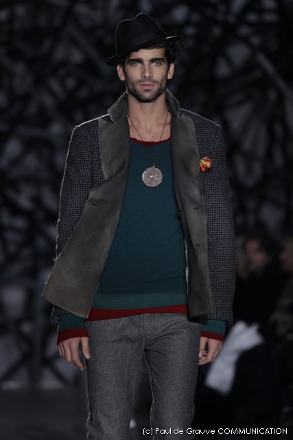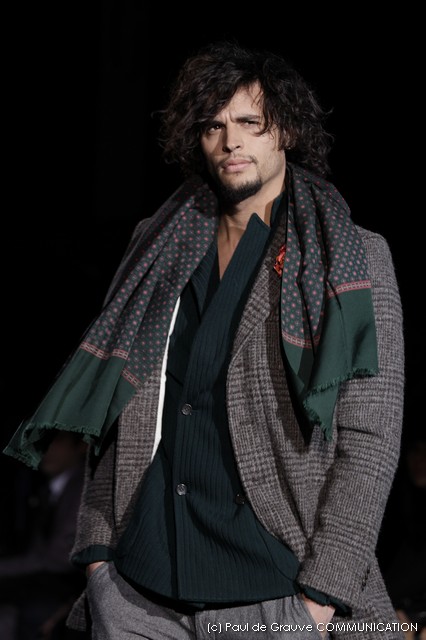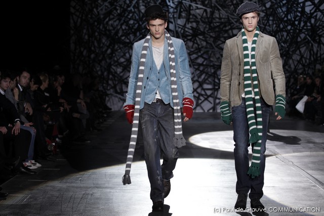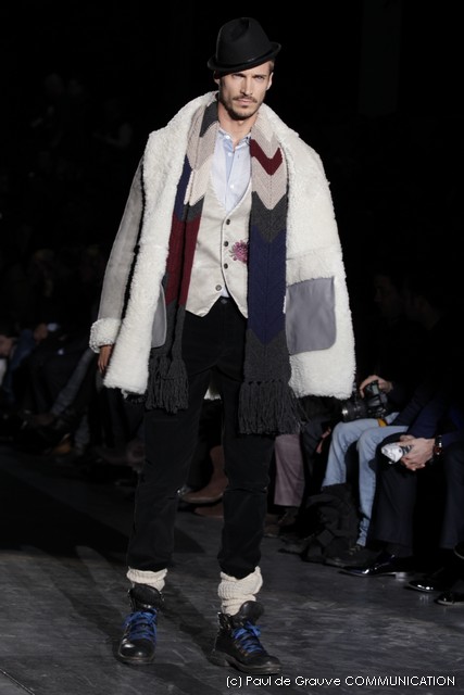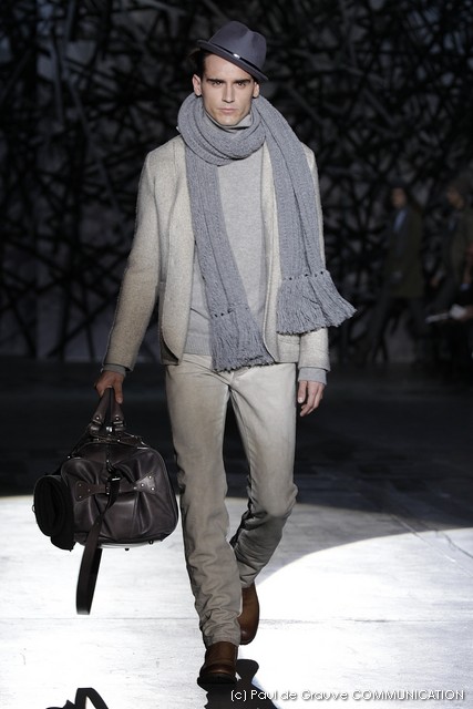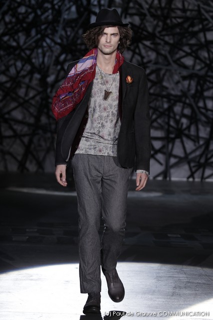 La collezione è ricca e comunque si fa ammirare. Molti i contrasti. Dall’abbigliamento trasandato a quello curatissimo quasi da dandy: pantaloni chiari, pullover grigio celeste, giacca sfoderata chiara, lunga sciarpa attorno al collo di un celeste più intenso, elegantissima borsa da viaggio per trasportare un plaid, cappello. L’elemento più ripetuto? Il gilet, portato su una T-shirt fantasia, o bianca, vezzosamente ricamato con un fiore.